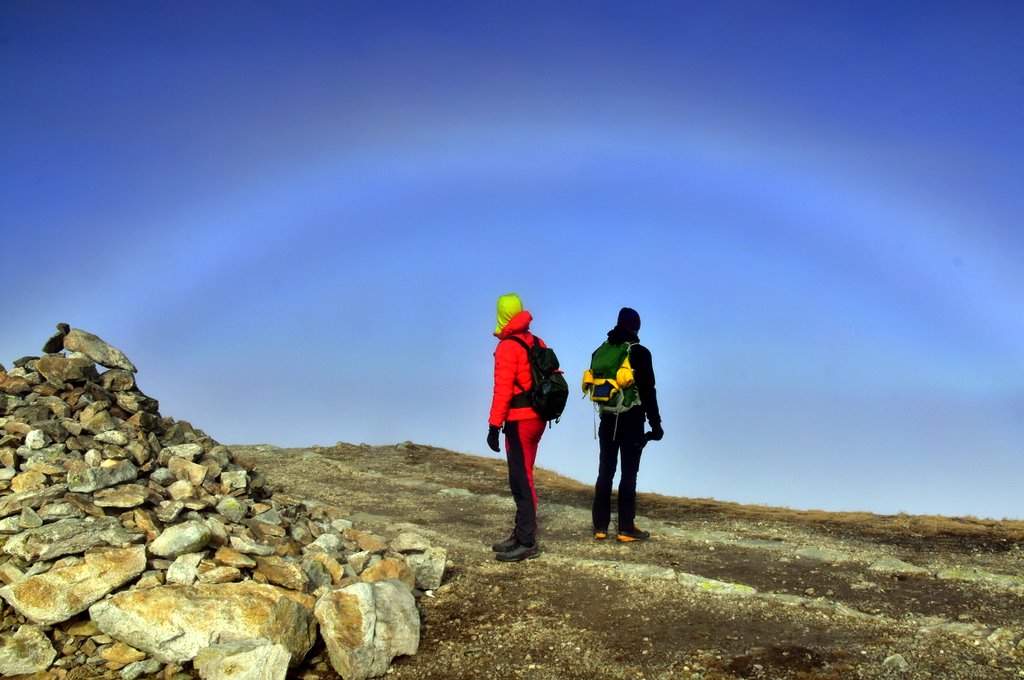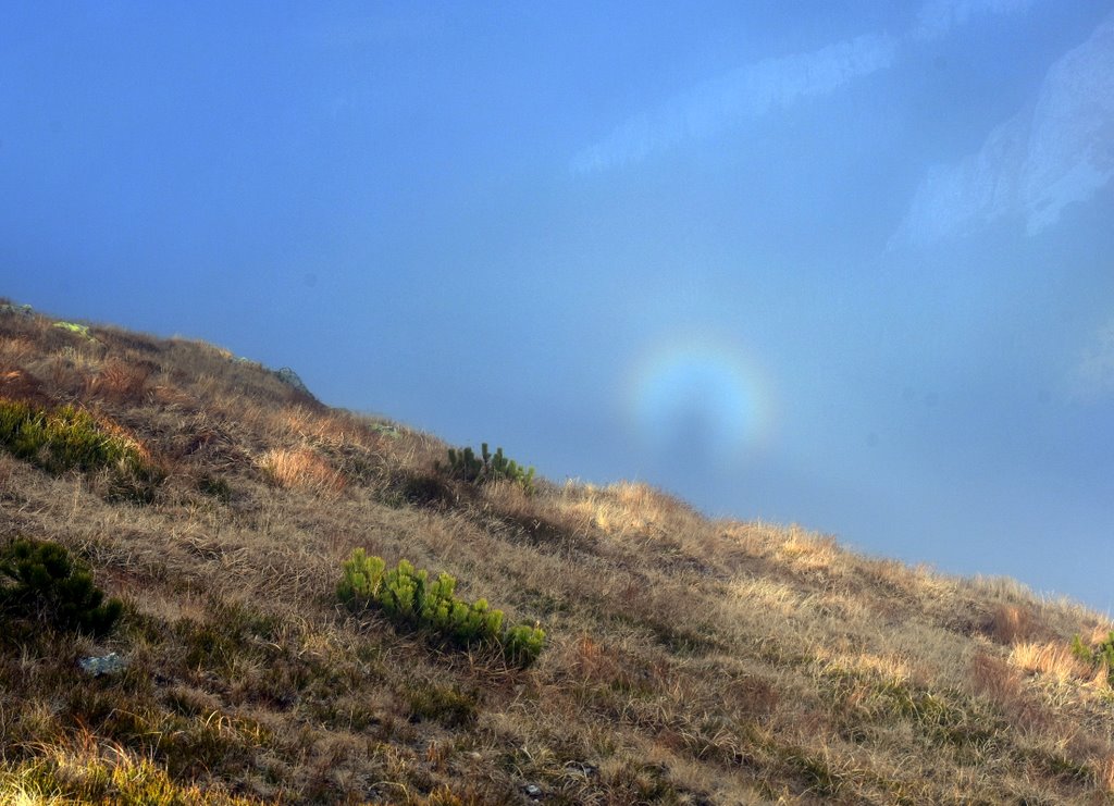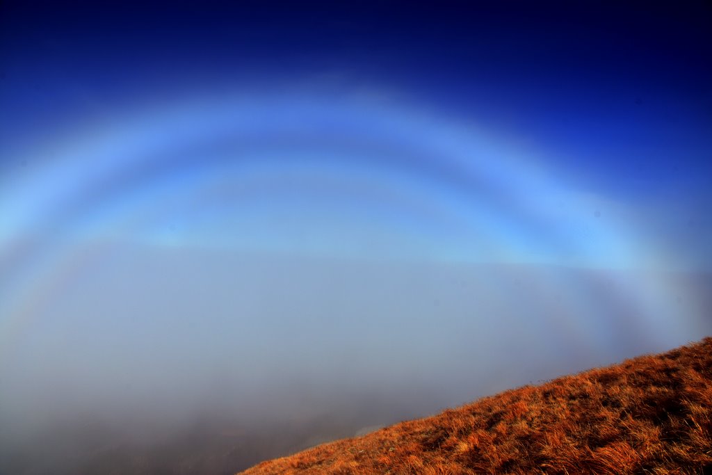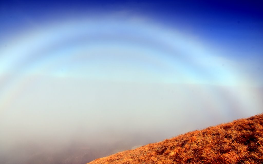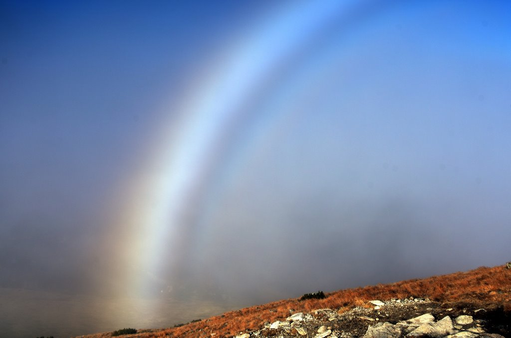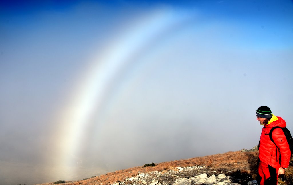 Chodząc po Tatrach od wielu lat miałem okazję widywać Widmo Brockenu wielokrotnie i o każdej porze roku. Jednak biała tęcza jest zjawiskiem tak rzadkim, że widuję ją zaledwie co kilka lat. Ostatnie przejście przez jesienne Czerwone Wierchy u progu zimy, nie zapowiadały aż tak spektakularnego zjawiska. Schodząc z wierzchołka Ciemniaka, miałem okazję obserwować białą tęczę oraz kolorową na mgle tzw fog bow a także widmo Brockenu w glorii. Fog bow charakteryzuje się tym, że maj zewnętrzną krawędź czerwona, a wewnętrzną niebieską. Gdy kropelki wody we mgle są bardzo małe, łuki mają biały kolor, i powstaje zjawisko białej tęczy. To właśnie mogłem obserwować w tym przypadku.