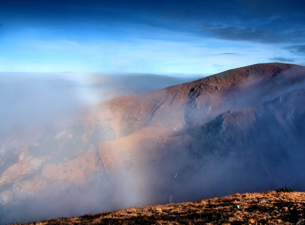 Krawędź fog bow na tle zboczy Małołączniaka nad Doliną Mułową.