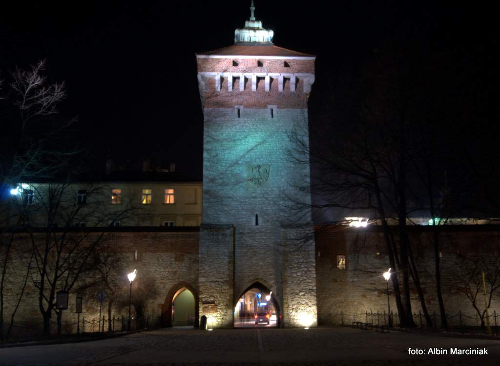 Brama Floriańska to główna brama miejska, po raz pierwszy wzmiankowana w źródłach historycznych w 1307 r. Jej nazwa pochodzi od położonego pobliskiego kościoła św. Floriana na Kleparzu. W XIV w. uzyskała formę wysokiej wieży kamiennej na planie zbliżonym do kwadratu, wraz z prostym czworobocznym przedbramiem. Bramę przecinał przejazd o ostrołukowym sklepieniu, od strony miasta zabezpieczały ją drewniane wrota, a od zewnątrz drewniana lub żelazna krata, która była podnoszona i opuszczana po specjalnych kamiennych prowadnicach.