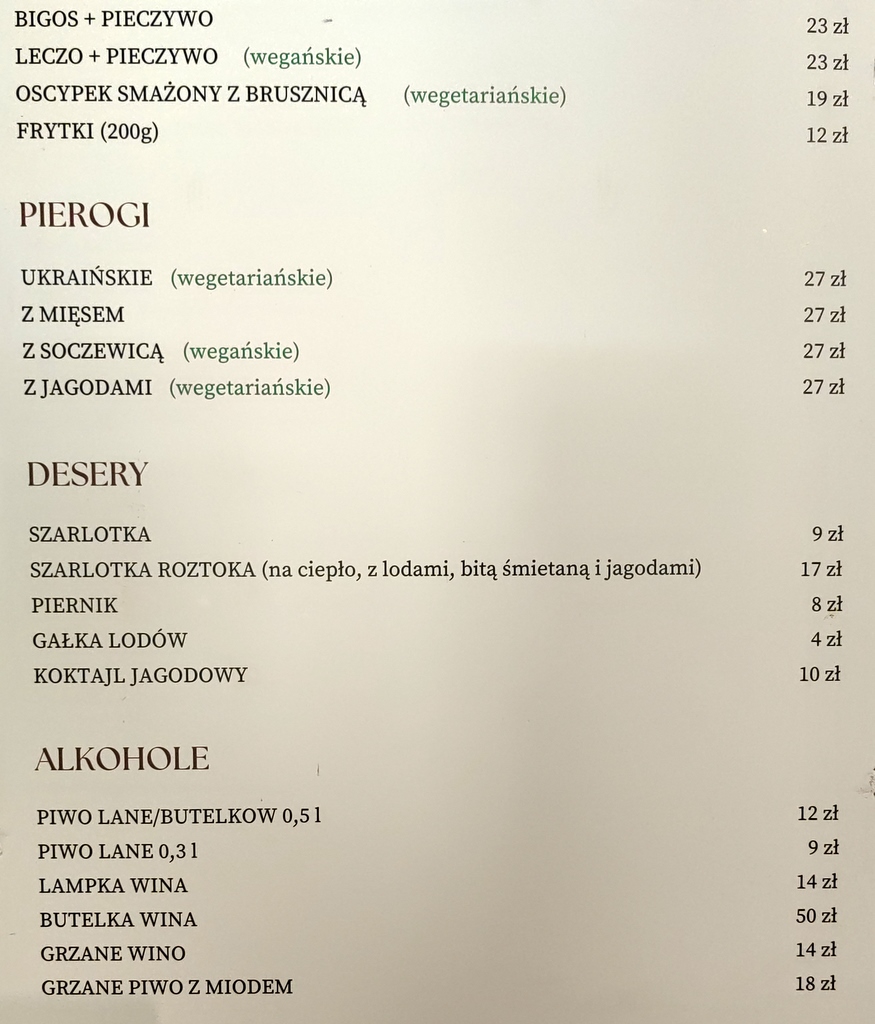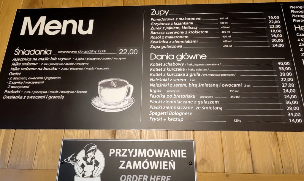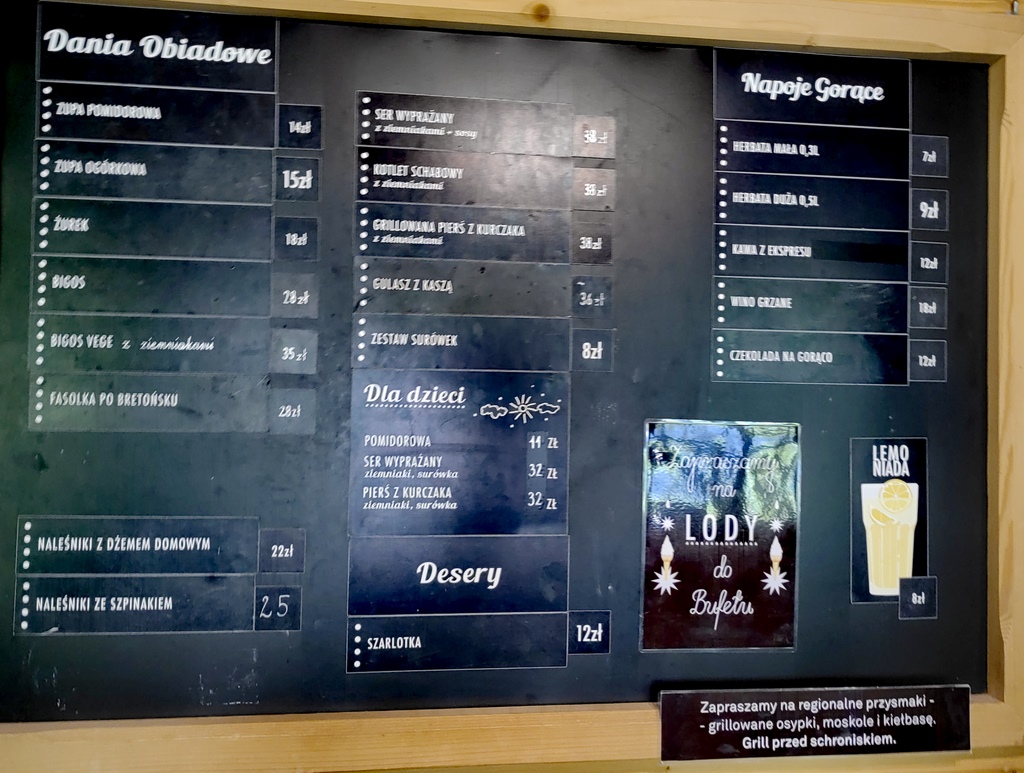 Ceny ? Myślę że takie właśnie naleśniki za 24 pln mogą rywalizować z goframi na molo w Międzyzdrojach czy choćby na zakopiańskich Krupówkach. Za to klimat i lokalizacja bez porównania. Inne pozycje ze schroniskowego menu: schabowy z ziemniakami i surówkami – 39 pln, placki ziemniaczane ze śmietaną 14 pln, bigos z pieczywem 23 pln, zupy (wybór) po 17-19 pln.