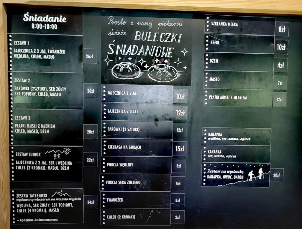 Punktualnie o 8.00 otwierana jest kuchnia ale kolejka chętnych po świeże bułeczki ustawia się nieco wcześniej. Mimo że jest to jedyne schronisko w Tatrach gdzie nie można dojechać a cały transport jest mocno ograniczony, to jednak ceny są w większości pozycji niższe niż w centrum Zakopanego. Nie zawiodą się także osoby zamawiające zestawy śniadaniowe, bo poza wyjątkowymi szarlotkami, od niedawna w kuchni stanął specjalny piec do wypieku bułeczek. Po takim śniadaniu aż chce się wyruszać na górskie szlaki.