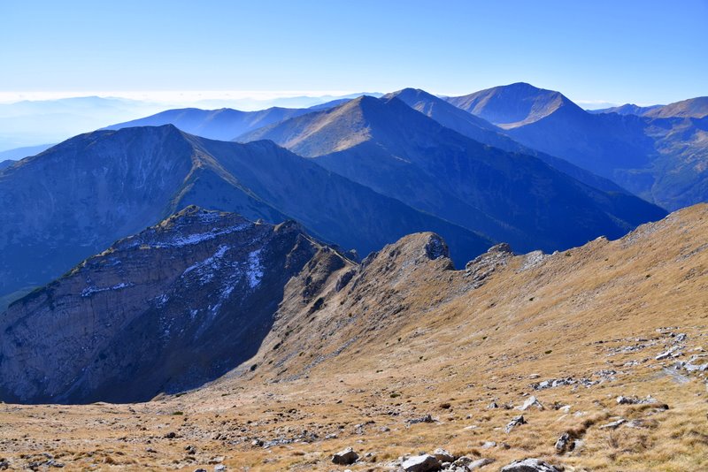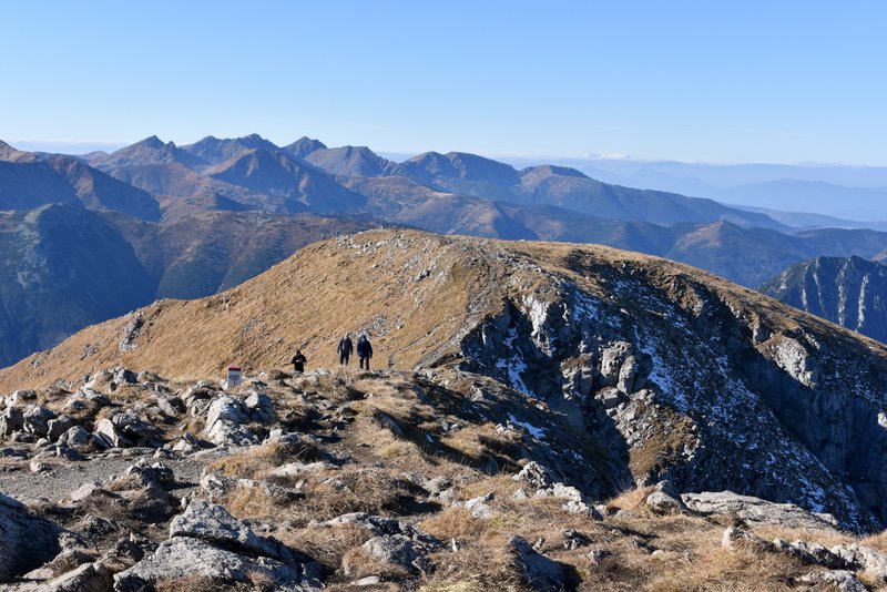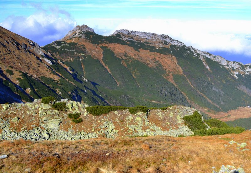 W drugą stronę mamy widok na Świnicę i zbocza opadające do Cichej Doliny. Bardziej na prawo niemal na wyciągnięcie ręki jest symbol Słowacji, czyli Krywań.