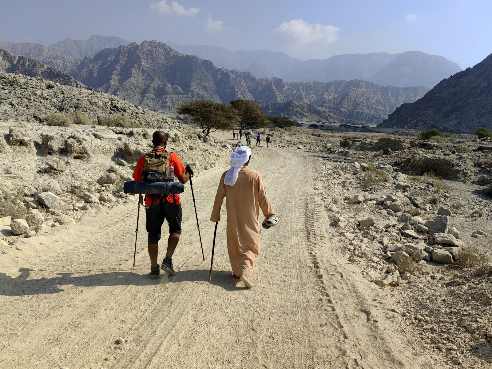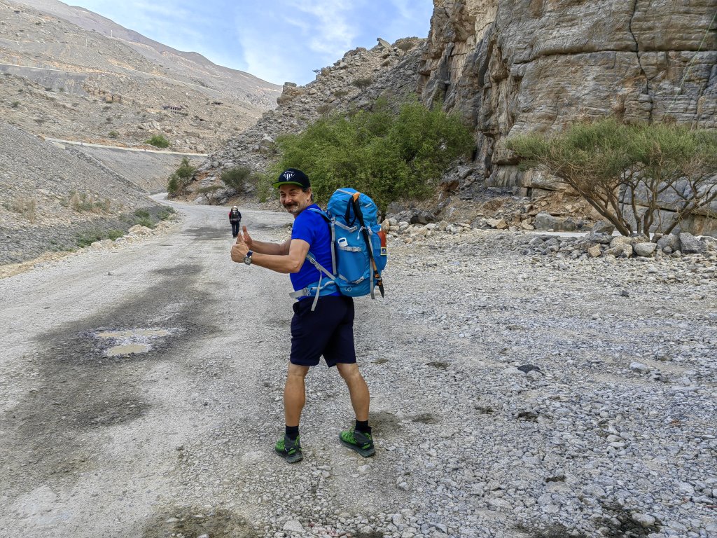 Daleko nad nami widać wierzchołek Jebel Jais czyli najwyższej góry w Zjednoczonych Emiratach Arabskich. Tam także zaplanowany jest nasz pierwszy biwak i nocleg. Szlak którego nie widać, wije się pomiędzy skałami i warstwami rumoszu, przecinając urwiste zbocza grzbietu górskiego. Przede mną kilkugodzinna mozolna wędrówka przerywana postojami na odpoczynek i picie. Na jedzenie w tych warunkach nie mam absolutnie najmniejszej ochoty. słońce jest bezlitosne i mimo połowy listopada, temperatura sięga +32 stopni w cieniu a w słońcu jest nie do wytrzymania. Dookoła tylko skały. Krok za krokiem i tak mijają kolejne godziny. W końcu dochodzę do miejsca gdzie zbocze pokryte różnej wielkości skałami kończy się kilkaset metrów wyżej betonowym murkiem zakrętu drogi. Wysoko nade mną na skale widzę jakąś postać. Czuję ulgę bo to znak że jestem już prawie u celu. Celu dzisiejszego odcinka. Kolejne kroki i minuty podejścia resztkami sił i wreszcie słyszę okrzyki i oklaski. Tak witani byli wszyscy dochodzący do kolejnych punktów. Mam też drugą pieczątkę jaka jest konieczna do potwierdzenia przejścia całej trasy.