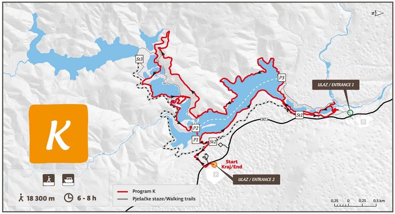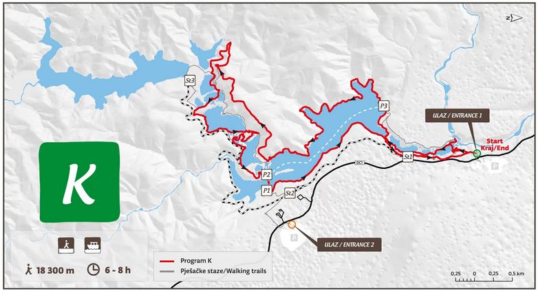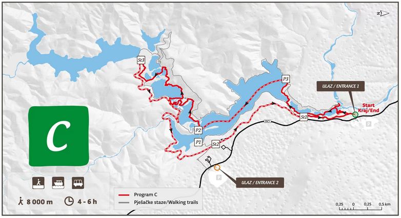 Program rozpoczyna się przy wejściu południowym (Wejście 2) i obejmuje piesze zwiedzanie dużej części strefy jezior w Parku Narodowym Jezior Plitwickich. Wędrowcy zobaczą Wielki Wodospad, przejdą przez kanion Jezior Dolnych i wzdłuż zachodniego wybrzeża jeziora Kozjak, dalej do wodospadów Prštavci, największych i najpiękniejszych wodospadów Jezior Górnych, i odwiedzą niedawno otwarty punkt widokowy Tomićevo Pogledalo. W drodze powrotnej spacerowicze mogą podziwiać wspaniałe Jeziora Górne i spacerować wzdłuż wschodniego brzegu jeziora Kozjak, do którego można dotrzeć krótką przejażdżką łodzią elektryczną. Kontynuacja programu obejmuje spacer po wschodniej stronie kanionu Lower Lakes, aż do punktu początkowego przy wejściu 2.