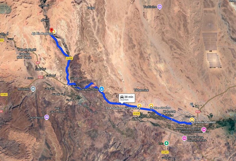 W pobliżu znajduje się największe studio filmowe na świecie „marokańskie Hollywood”. W Atlas Studios nakręcono ponad 200 znanych na całym świecie filmów i seriali telewizyjnych, w tym „Gladiator”, „Ben Hur”, „Królestwo Niebieskie”, „Mumia”, „Pasja”, a ostatnio hit serialu „Gra o tron”. To tutaj kręcono Królestwo niebieskie Ridleya Scotta a Atlas Studios ma trzy plany filmowe, z których jeden jest repliką Jerozolimy. Wizyta tutaj to uczta dla ciała i duszy dla kinomanów.