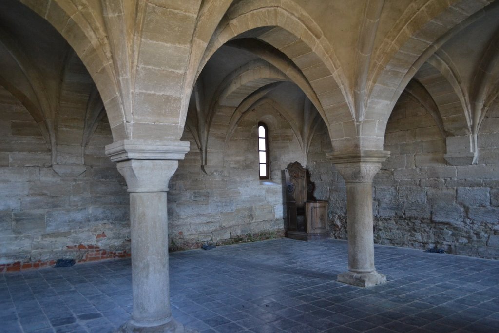 W połowie XIV w. z inicjatywy arcybiskupa gnieźnieńskiego Jarosława Bogorii ze Skotnik następuje przebudowa w stylu gotyckim zniszczonej części klasztoru. Powstałe wówczas skrzydło północne klasztoru mieściło dwa refektarze, a zachodnie pomieszczenia dla pracujących braci konwersów.