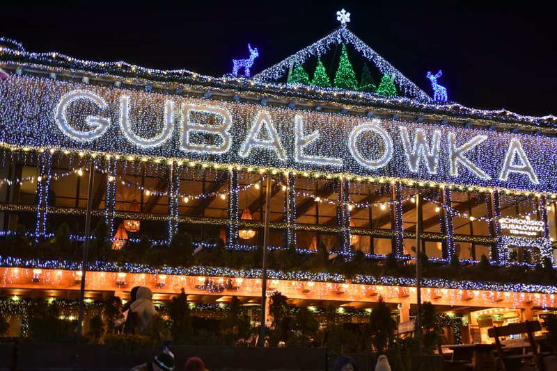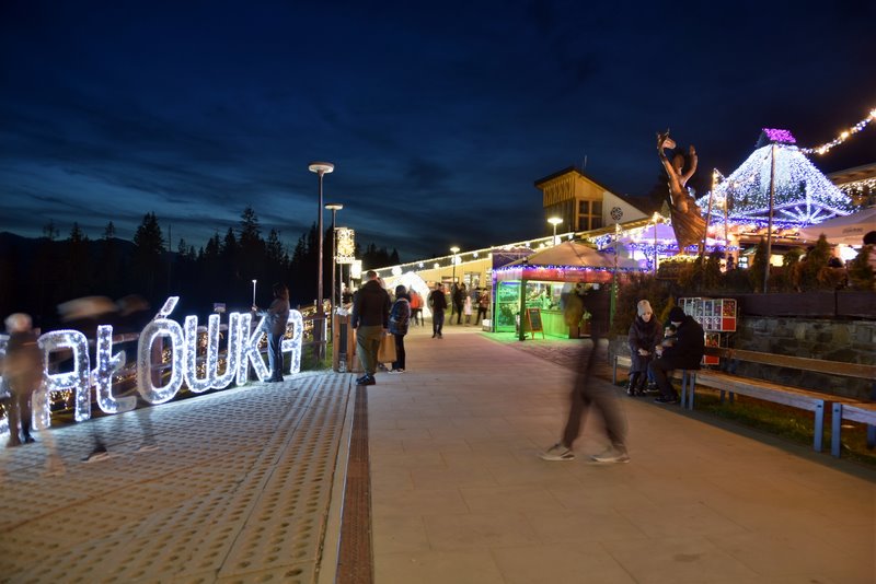 Na szczycie znajdziesz punkty gastronomiczne i restauracje, co pozwala połączyć spacer w świetlnej oprawie z kolacją lub noclegiem w Zakopanem.