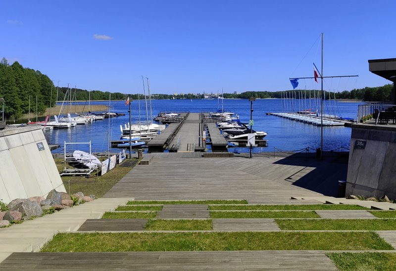 Nie, nie jest to tylko pusty slogan reklamowy bez pokrycie. Zdaniem międzynarodowych ekspertów Centrum Rekreacyjno-Sportowe „Ukiel” OSiR w Olsztynie to najlepsza przystań śródlądowa na świecie. Będąc na miejscu i składając wszystkie elementy w jedną całość muszę przyznać że coś w tym jest. Na zdjęciu przystań i Centrum Żeglarstwa Wodnego i Lodowego „Słoneczna Polana”, po drugiej stronie jeziora Ukiel. Tutaj można zacumować w trakcie rejsu po jeziorze a ja zrobiłem sobie przerwę podczas przejażdżki rowerem wokoło jeziora. Główna plaża i molo przy OSiR znajduje się po drugiej stronie jeziora, na wprost pomostu.