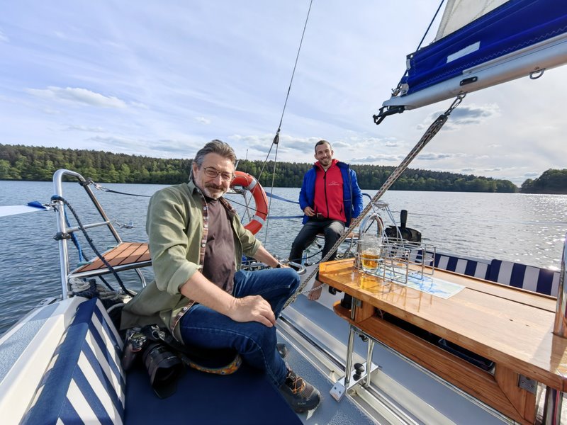 Na jeziorze Ukiel nie można odmówić sobie rejsu żaglówką, a że nie mam patentu i nie umiem prowadzić takiego wodnego bolida, to dałem się namówić na rejs pod okiem fachowców. Kpt. Tomek Siemaszko i Magda Wojciechowska zabrali mnie na rejs po całym jeziorze, pokazując przy okazji okolicę z pokładu, i wszystko to co dotychczas widziałem objeżdżając jezioro rowerem. Mając zapewnioną pełną obsługę, można się zresetować i rozleniwić, zwłaszcza mając słońce nad głową i szum fal przecinanych sunącym jachtem. Jeżeli ktoś poczuje w sobie zew wilka morskiego, można się umówić z Tomkiem na rejsy pełnomorskie, z wyprawami na daleką północ włącznie.