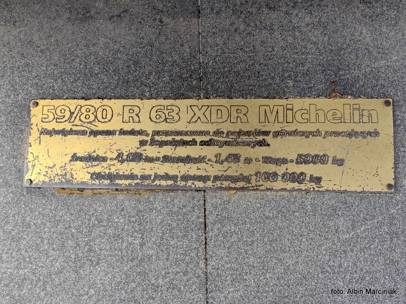 Oznaczona symbolem 59/80 R 63 MICHELIN XDR to największa opona świata, przeznaczona do pojazdów górniczych pracujących w kopalniach odkrywkowych. Średnica – 4,03 m, szerokość – 1,48 m, waga – 5000 kg. Zbrojenie wewnętrzne to aż 890 kilogramów stali. Obciążenie na jedną oponę powyżej 100 000 kg. Mimo że opona stoi przed zakładem w formie pomnika to nie jest wyłącznie ozdobą firmy. Takie opony są produkowane w Olsztyńskiej fabryce. Jaki może być koszt takiego kolosa ? Niestety nie są to ceny katalogowe a takie zamówienia negocjowane są indywidualnie. Mniejsza, bo zaledwie 57-calowa i starsza siostra XKD1, kosztuje około 350 tys. zł. Biorąc pod uwagę że np taki BiełAZ 75710 ma założone 6 sztuk, to za same opony tej ciężarówki trzeba zapłacić sporo ponad 2 mln zł. Zresztą za takiego giganta trzeba też słono zapłacić, bo chcąc zamówić wywrotkę ze standardowym wyposażeniem to jej cena może przekroczyć granicę 5 milionów dolarów.