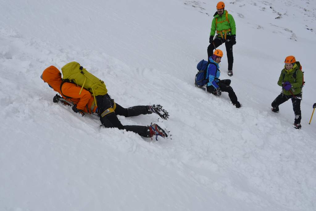 Prawidłowe hamowanie czekanem. Grot czekana na wysokości klatki piersiowej. Kolana zgięte a stopy uniesione, by nie zaczepić rakami o podłoże i nie zmienić kierunku.