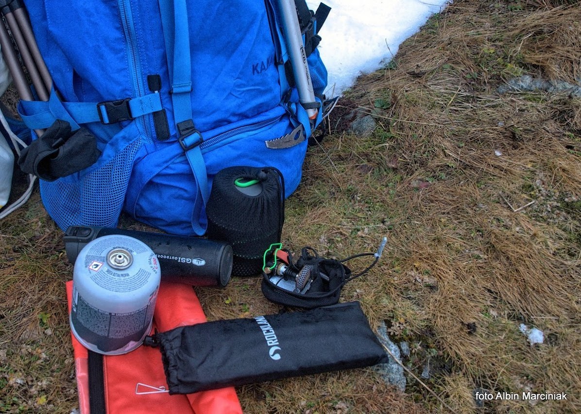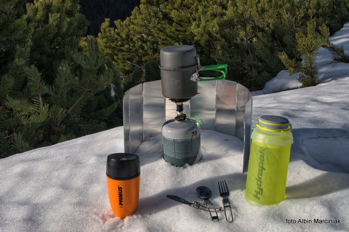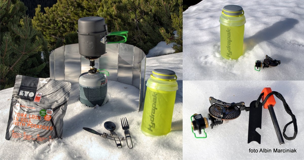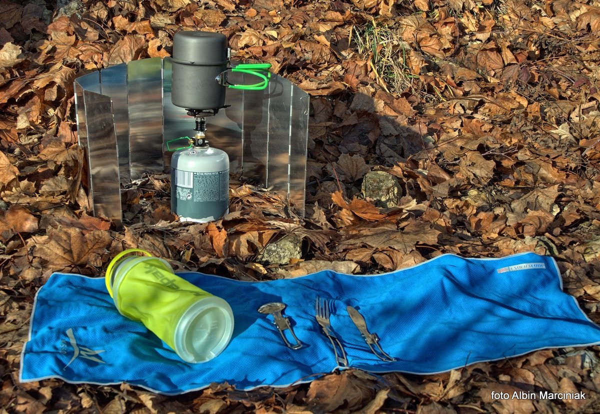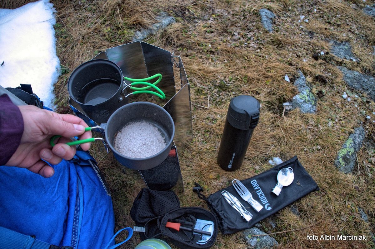 Sięgamy do plecaka, by wyciągnąć sprzęt i zagotować wodę. W sklepach mamy dostępne różne palniki i kilka systemów mocowania palników do kartuszy. Testowany palnik Optimusa, to jeden z najmniejszych i najlżejszych (83g) palników, co przy dłuższych wędrówkach ma istotne znaczenie. Podobnie jak waga naczyń i sztućców, które mamy w plecaku. Testowany zestaw to Terra Solo Cook Set. Jak to w górach, często wieje. Tutaj przydaje się lekki harmonijkowy parawan, osłaniający palnik przed wiatrem. Skutecznym i nieodzownym w takim przypadku jest krzesiwo. Nie zapałki czy zapalniczka, ale właśnie krzesiwo jest niezastąpione. Nie zamoknie, nigdy się nie wyczerpie i odpala przy każdej temperaturze.