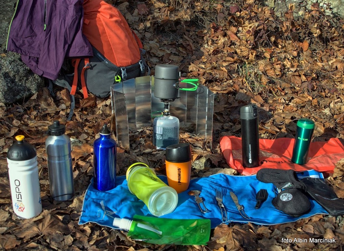 Tak wygląda cały zestaw, dzięki któremu jesteśmy samowystarczalni na szlaku. Kartusz z gazem, palnik Crux i krzesiwo (iskrownik), osłona przed wiatrem, naczynia, sztućce i pojemnik na wodę mieszczą się w jednym opakowaniu, i do tego lekki termos.