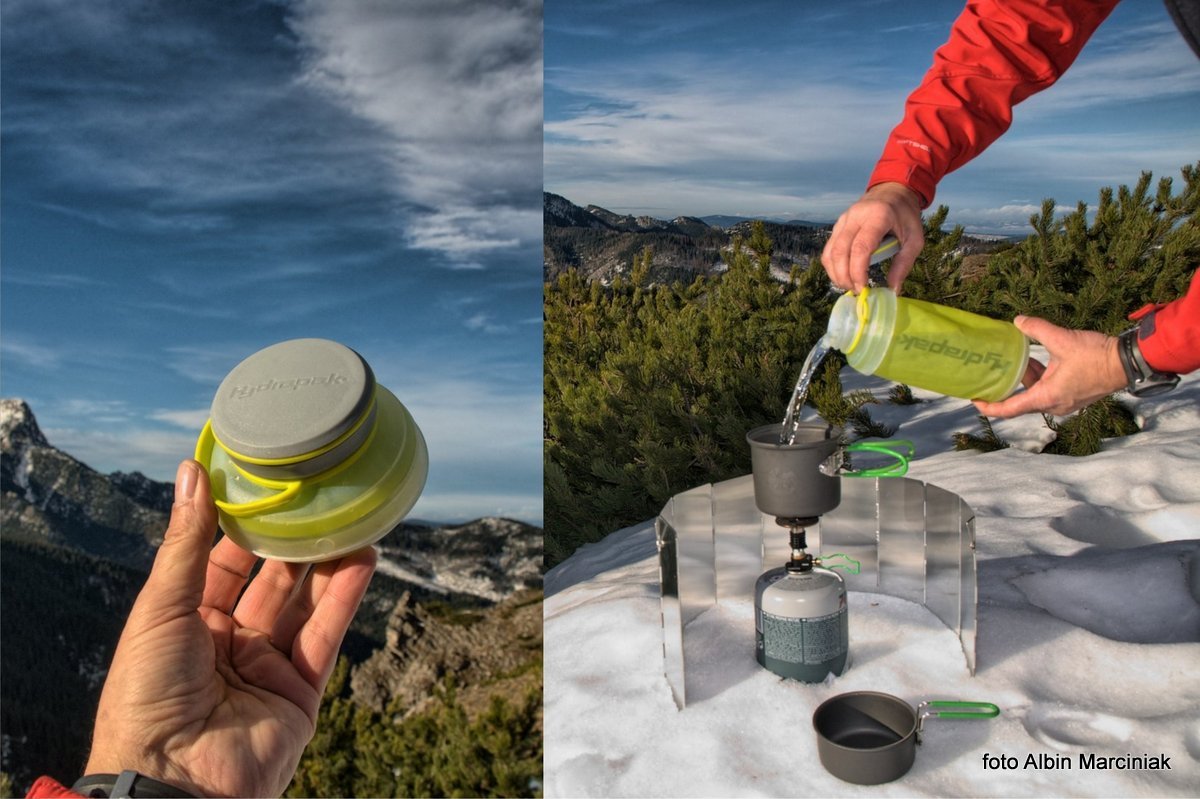 Hydrapak po złożeniu mieści się w małej kieszeni. W górach woda bywa dostępna w wielu miejscach. W zimie możemy posłużyć się śniegiem. Oczywiście poza żółtym 🙂