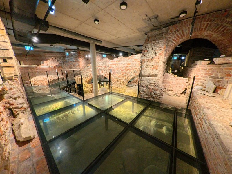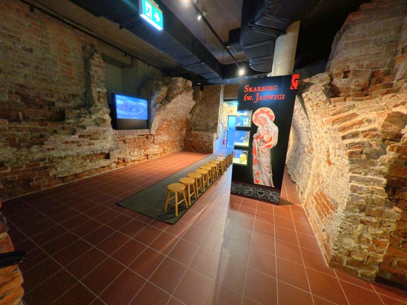 Przejście trasą prowadzącą do podziemi auli Henryka IV Probusa, gdzie interpretacja łączy architekturę i polityczną narrację Piastów.