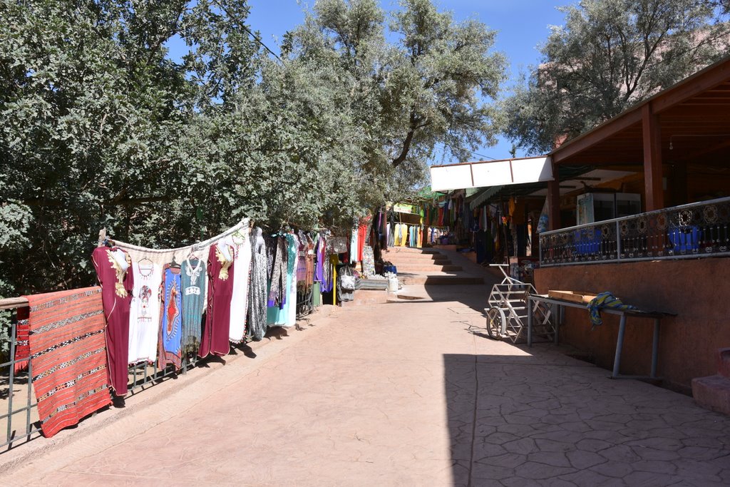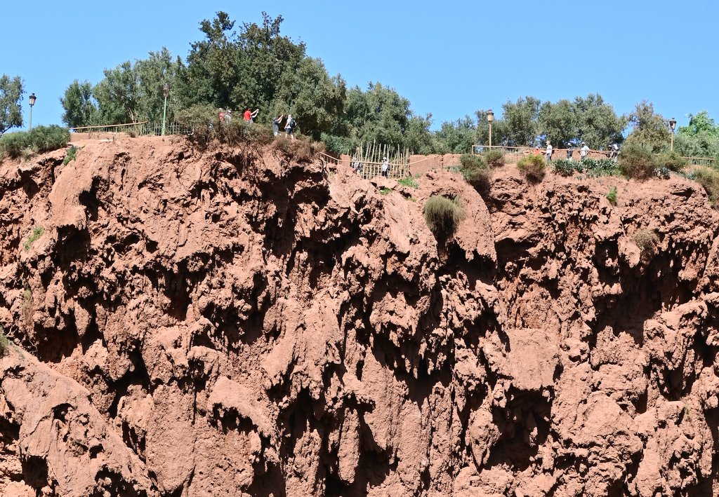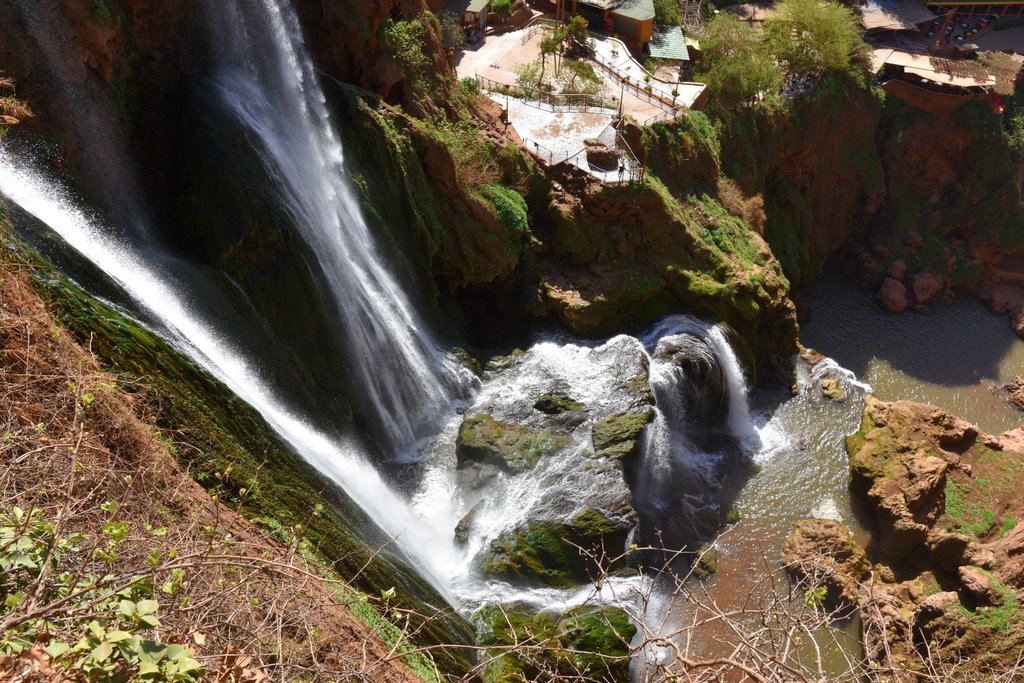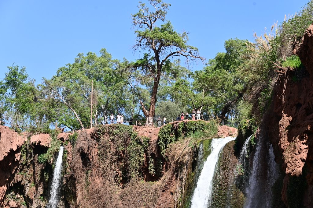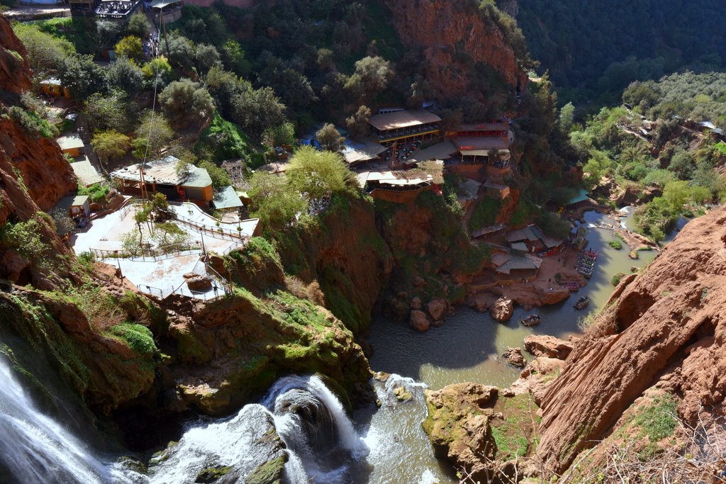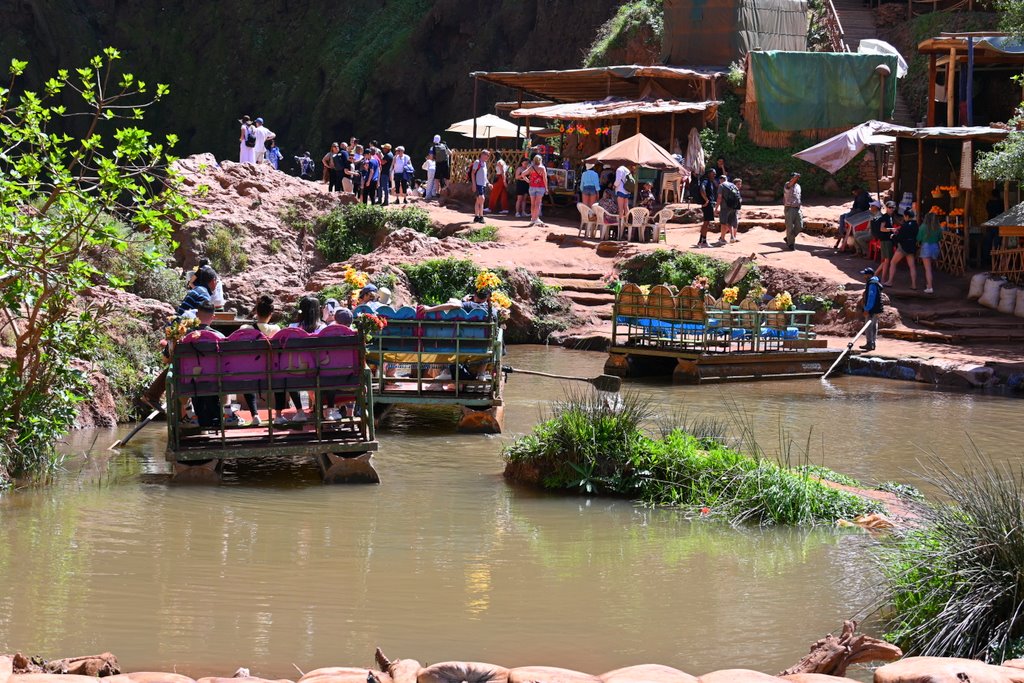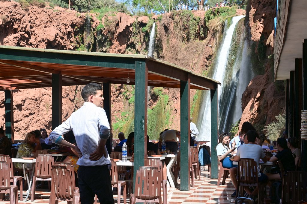Po bliskim spotkaniu z wodospadem, tratwy dobijają do drugiego brzegu. Stąd betonowe alejki i schody prowadzą na kolejne tarasy widokowe. Na kilku takich tarasach są także restauracje i sklepiki z pamiątkami. Kto nie był nad Bałtykiem i nie zjadł drogiej ryby, czy w Zakopanem nie przepłacił parokrotnie za oscypka, ten ze zdziwieniem będzie się przyglądał tłumom chcącym zjeść cokolwiek, czekając na stolik z widokiem na majestatyczne kaskady wody. Wybór niewielki a za większość pozycji z menu należy zapłacić od ok 120 dirhamów wzwyż. Byłem, zjadłem i głodny wyszedłem. Kultowe zdjęcie z Misiem na Krupówkach także ma swoją cenę, podobnie jest i nad wodospadem Ouzoud.