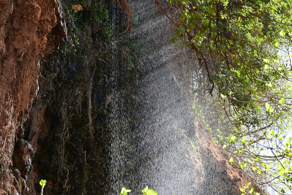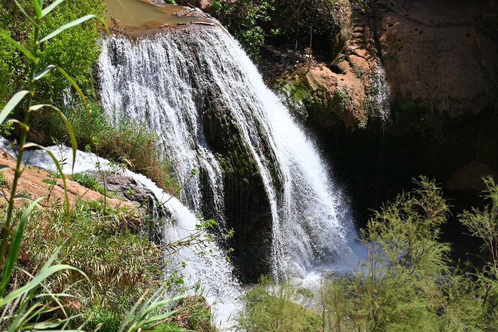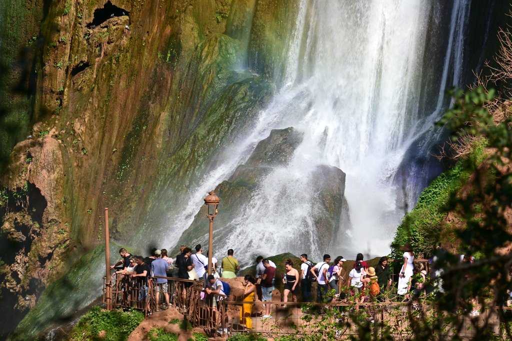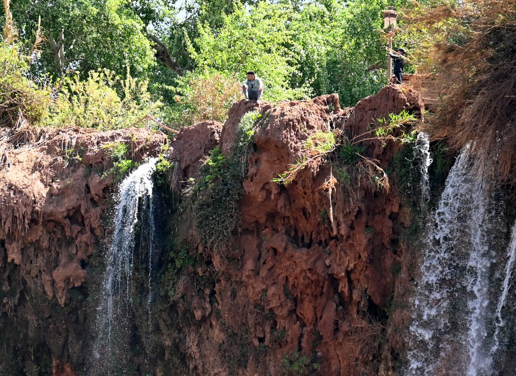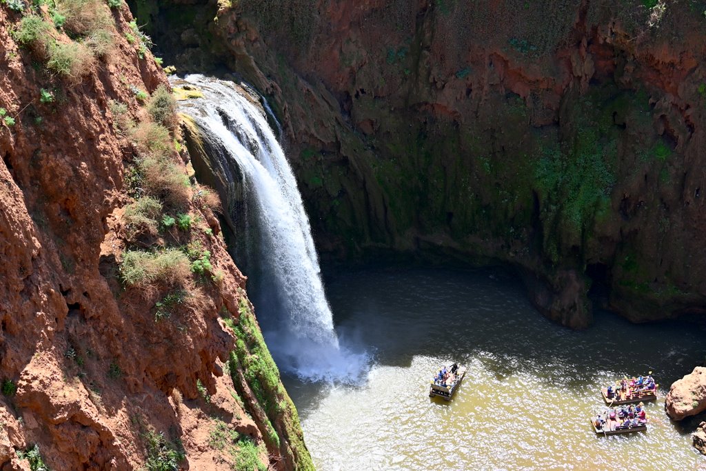Po ok 40 minutach wędrówki, licząc od wyjścia z autokaru i przejścia górnej części, dochodzimy do rozlewiska z opadających mas wody z wodospadu znajdującego się ok 100 m dalej. Czas na kolejne dziesiątki zdjęć i podziwianie majestatu wodospadu. Można ten majestat podziwiać z bardzo bliska, z chłodzącą bryzą na twarzy. Bywa że i niezłego schłodzenia, gdy wiatr mocniej zawiruje opadającą wodą. Te atrakcje można poczuć za jedyne 20 dirhamów, bo tyle kosztuje kilkunastominutowa przejażdżka tratwami podpływającymi pod sam huczący wodospad. Z tej odległości opadająca masa wody robi duże wrażenie a mimo palącego słońca mocno schładza.