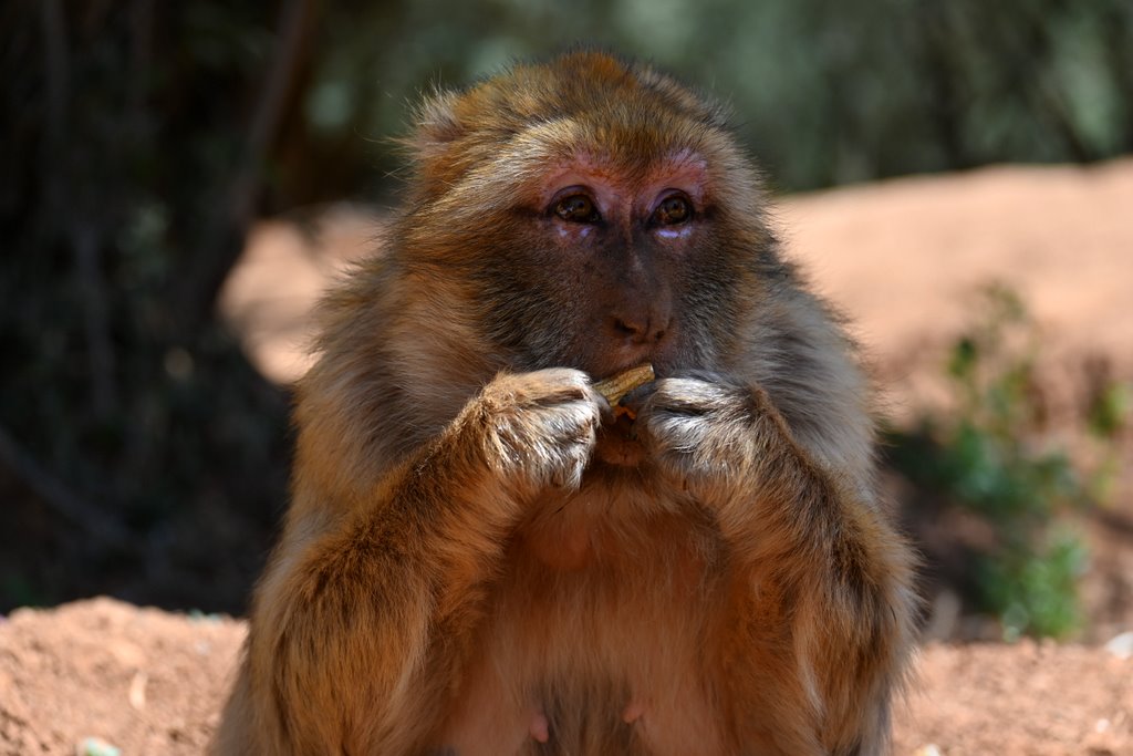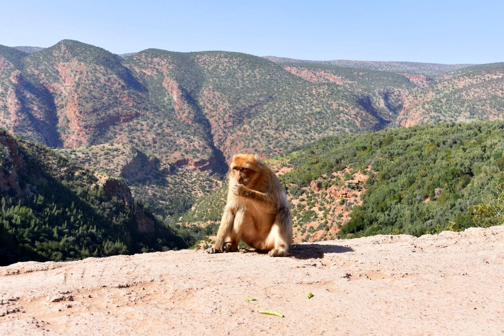 Po przejściu alejkami na ostatni taras widokowy gdzie wodospad mamy w pełnej okazałości, zaczynamy być otaczani przez małpki Makaki. Te sympatyczne stworzenia są już tak nauczone bliskości z ludźmi, że nie ma najmniejszego problemu na udane zdjęcia a nawet selfie. Karmione smakołykami są przez cały dzień a znużenie kolejnymi smakołykami widać aż nadto. No ale jak tu nie podać małpie orzeszka by ta zrobiła dobrą minę do zdjęcia? Wszak dla wielu jadących do Marrakeszu właśnie makaki są główną atrakcją.