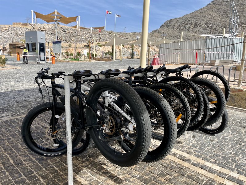 Jeżeli chcemy zasmakować jazdy rowerem górskim po górach Ras Al Khaimah to najlepiej skierować się do miejsca nazwanego „Viewing Deck Park”, które jest kilkupoziomowym tarasem widokowym przy głównej drodze prowadzącej pod szczyt Jebel Jais. Po jednej stronie mamy wybetonowane ścieżki i kamienne podesty widokowe, a z drugiej strony są ulokowane parkingi. To tam możemy wypożyczyć jednoślad (30AED za godzinę), a do wyboru jest 8 rowerów elektrycznych. I od razu dwa zaskoczenia. Jednoślady są marki „Saluki”, która jest rodzimym produktem Zjednoczonych Emiratów Arabskich.