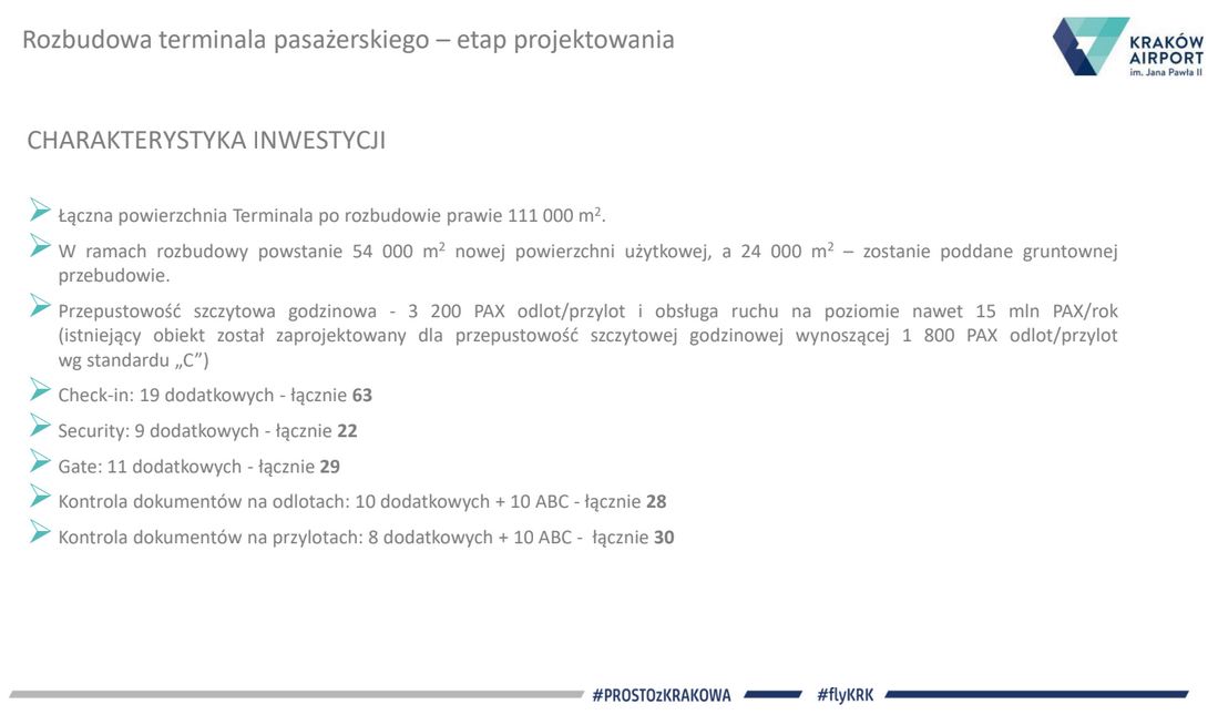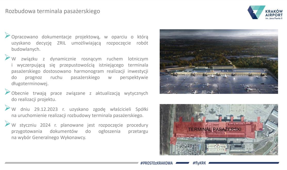 Przepustowość obecnego terminala pasażerskiego, oddanego do użytkowania po rozbudowie w grudniu 2016 roku jest już niewystarczająca, aby obsłużyć tak intensywnie wzrastający ruch.” powiedział Radosław Włoszek, prezes Kraków Airport. Dysponując decyzją  o zezwoleniu na realizację inwestycji w zakresie lotniska użytku publicznego na budowę  i rozbudowę nowego terminala pasażerskiego oraz zgody właścicieli- rozpoczynamy proces wyłonienia generalnego wykonawcy robót budowlanych i ruszamy z rozbudową. Przed nami wiele miesięcy  prac budowlanych.