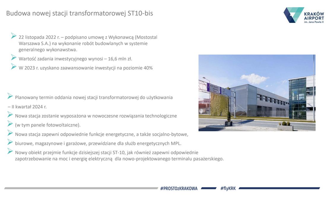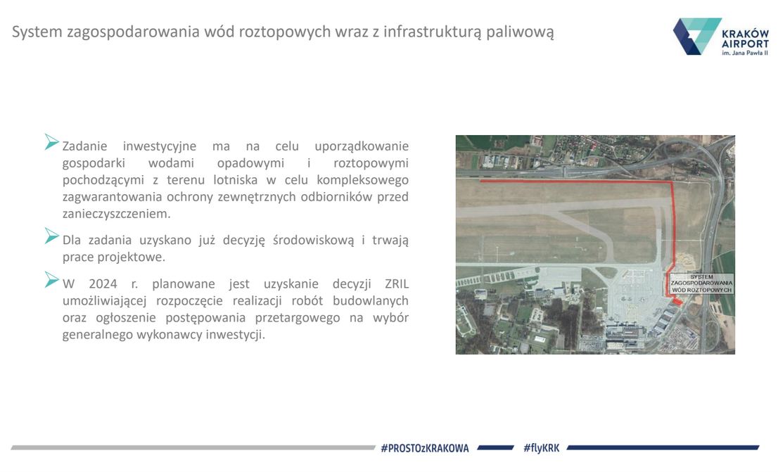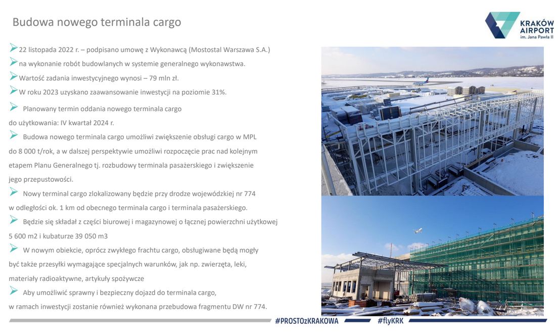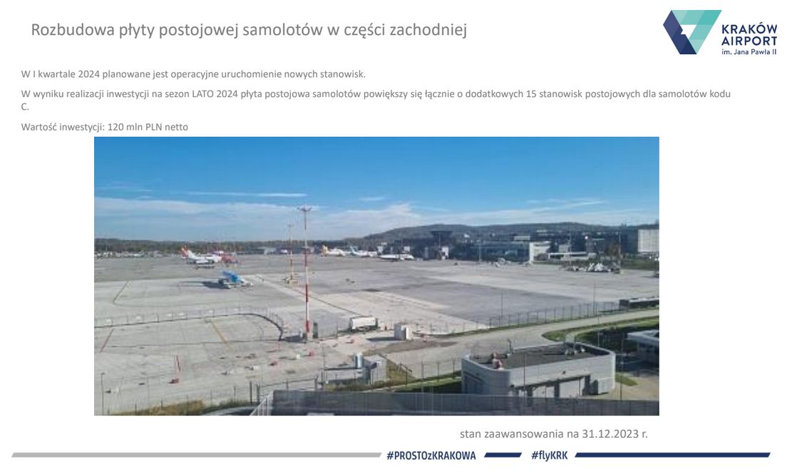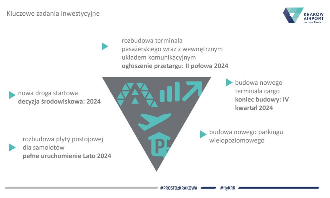 W 2023  rozbudowaliśmy płytę postojową lotniska, trwają zaawansowane prace w budowie  terminala cargo i obiektów infrastruktury towarzyszącej.Pod koniec grudnia wspólnicy Spółki Międzynarodowego Portu Lotniczego im. Jana Pawła II Kraków – Balice sp. z o. o. jednogłośnie zaakceptowali przedłożony przez zarząd „Plan Inwestycyjny Kraków Airport na lata 2024 – 2045”. Podjęta decyzja jest podstawą formalną dalszych planów rozwoju krakowskiego lotniska i realizacji Planu Inwestycyjnego na dalsze dekady zgodnie z Planem Generalnym  zatwierdzonym  w 2018r. Podjęto także  uchwałę o wyrażeniu zgody na podjęcie  przez Zarząd MPL czynności prawnych związanych z realizacją budowy i rozbudowy terminala pasażerskiego. Jedną z najważniejszych inwestycji pozostaje  nowa droga startowa, która ponownie procedowana jest w Regionalnej Dyrekcji Ochrony Środowiska. Czekamy na decyzję, będąc gotowym do rozpoczęcia realizacji powyższej  inwestycji. Budowa nowej drogi startowej umożliwia ciągłość funkcjonowania krakowskiego lotniska, bez konieczności jego zamykania na wiele miesięcy. Ta budowa, podobnie, jak rozbudowa terminala pasażerskiego, czy pozostałe projekty będą się toczyły  przy nieprzerwanie funkcjonującym lotnisku. To także inwestycja domykająca procedowane rozwiązania systemu gospodarki wodno-ściekowej na lotnisku, a także wdrożenie nowoczesnego systemu naprowadzania samolotów, umożliwiającego prowadzenie operacji lotniczych w warunkach ograniczonej widzialności. – podsumował Radosław Włoszek, prezes Zarządu Kraków Airport.