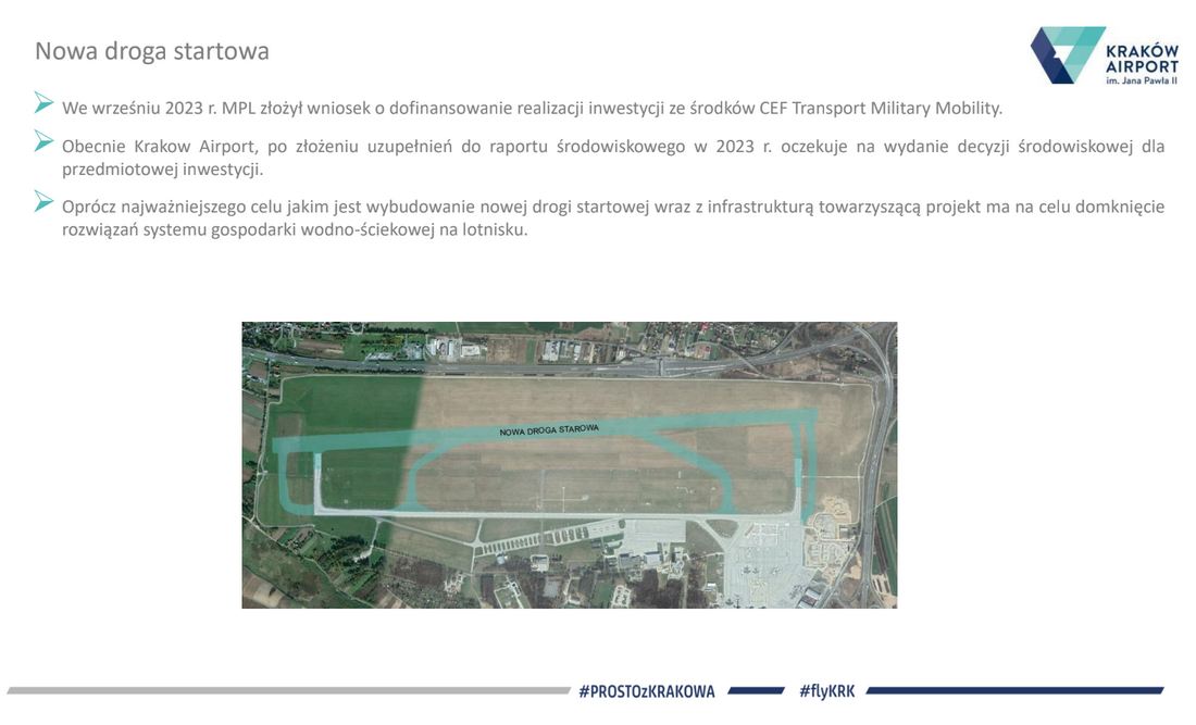 Odwiedzając krakowskie lotnisko łatwo zaobserwować jak jego infrastruktura zmienia się, dostosowując do potrzeb i oczekiwań pasażerów, ale także przewoźników. Obecnie zakończyliśmy rozbudowę płaszczyzny postojowej dla samolotów w części zachodniej, dzięki której już na najbliższy sezon letni port będzie dysponował dodatkowymi 15 stanowiskami postojowymi. W trakcie realizacji są inwestycje budowy nowego budynku Cargo oraz budowa nowej stacji energetycznej ST10-bis. To inwestycje bardzo istotne, aby móc myśleć o rozbudowie terminala pasażerskiego. Jedną z kluczowych  inwestycji zaplanowanych w Planie Generalnym lotniska pozostaje procedowana obecnie w Regionalnej Dyrekcji Ochrony Środowiska decyzja na budowę nowej drogi startowej, do której stosowne dokumenty złożyliśmy we wrześniu 2023r. Czekamy na decyzję, będąc gotowym do rozpoczęcia procedur administracyjno-budowlanych. Budowa nowej drogi startowej, umożliwia ciągłość funkcjonowania krakowskiego  lotniska, bez konieczności jego zamykania na wiele miesięcy. Ta budowa, podobnie, jak rozbudowa terminala pasażerskiego, czy pozostałe budowy będzie toczyła się przy nieprzerwanie funkcjonującym lotnisku.  To także inwestycja domykająca procedowane rozwiązania systemu gospodarki wodno-ściekowej na lotnisku, a także wdrożenie nowoczesnego systemu naprowadzania samolotów, umożliwiającego prowadzenie operacji lotniczych w warunkach ograniczonej widzialności.