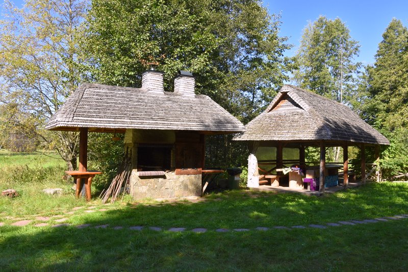 Bania (sauna) – zrekonstruowana w 1987, kryta gontem. Pierwotnie posiadała oryginalny piec z łukowym sklepieniem, na którym grzano kamienie.