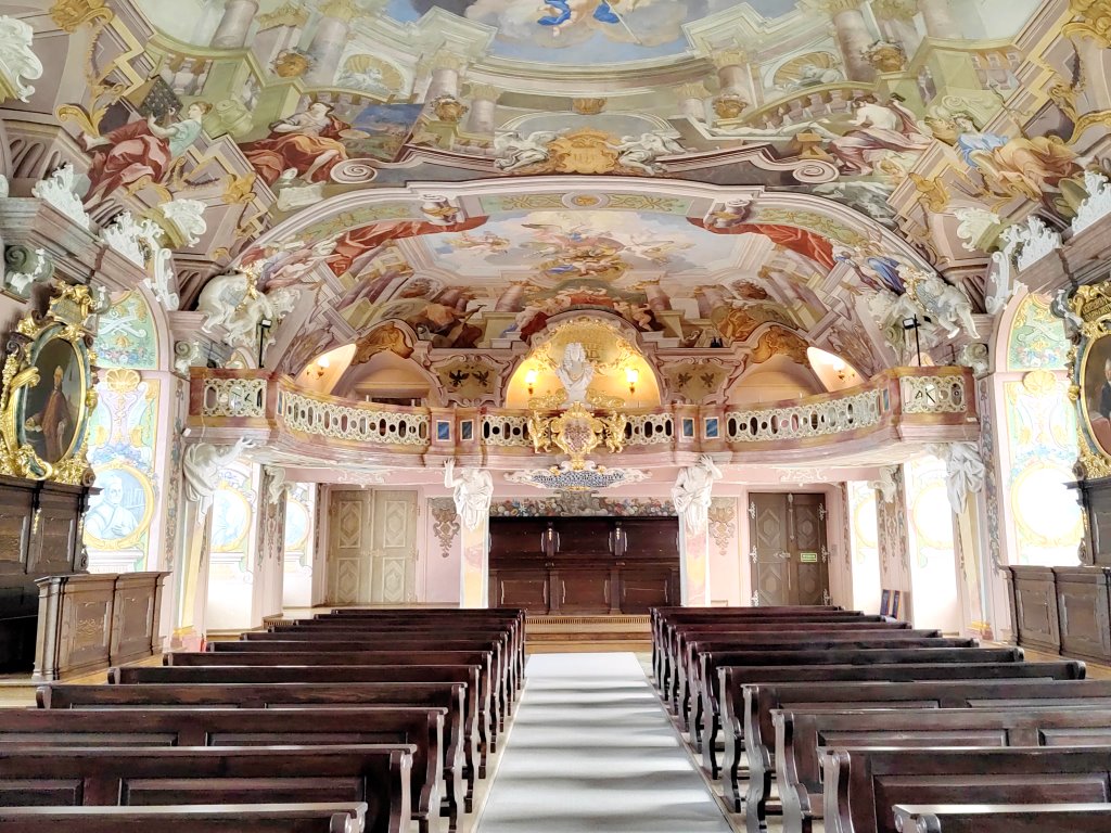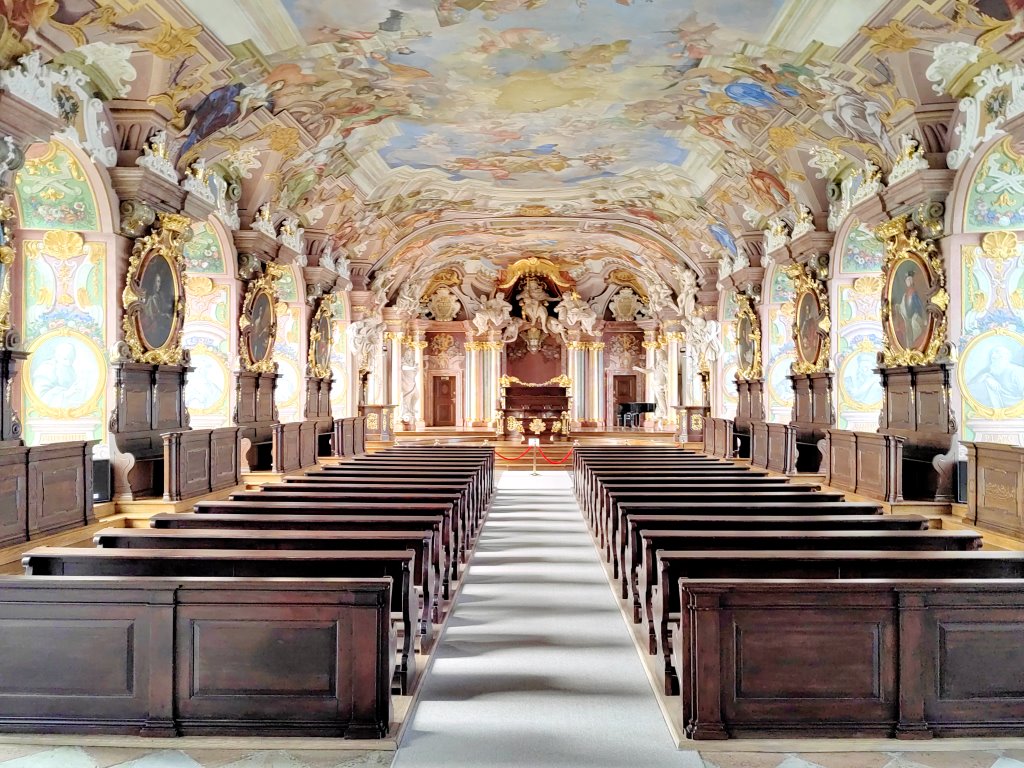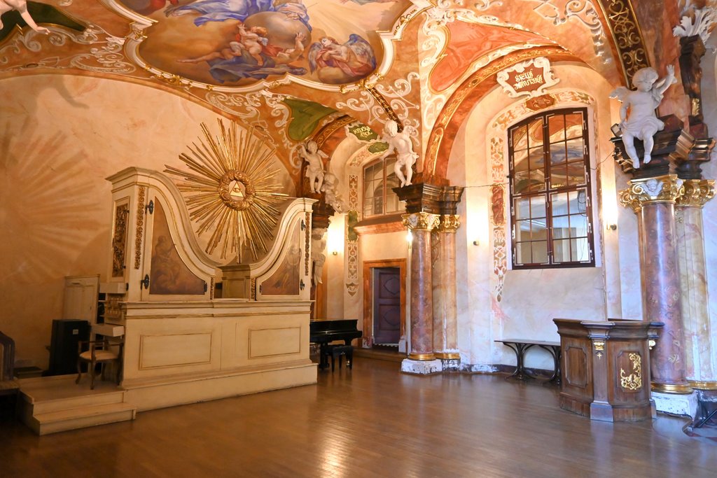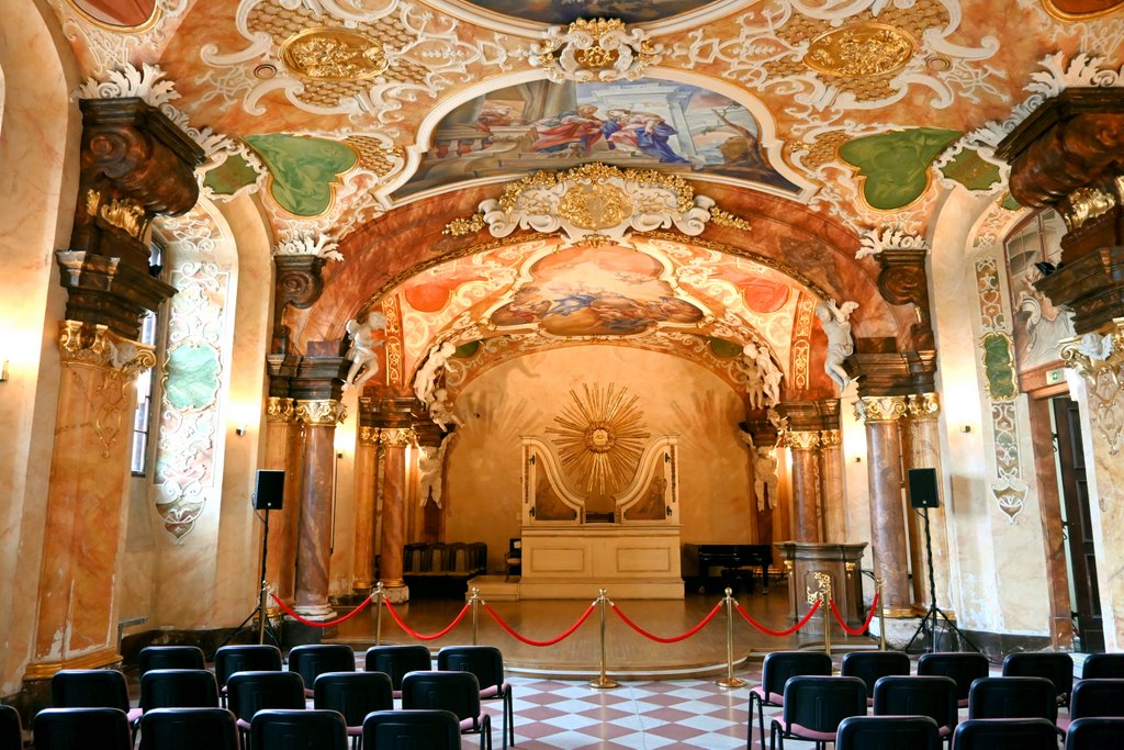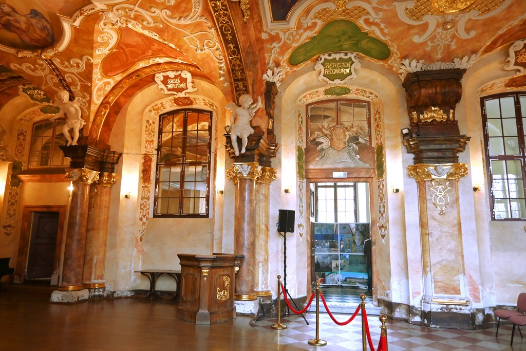 Przechodząc na pierwsze piętro stajemy przed bogato rzeźbionymi drzwiami. To za nimi kryje się kolejna wyjątkowa sala. Ta część muzeum była przez długi czas niedostępna a po renowacji ponownie można podziwiać kunszt rzeźbiarzy i malarzy będących twórcami tego miejsca.