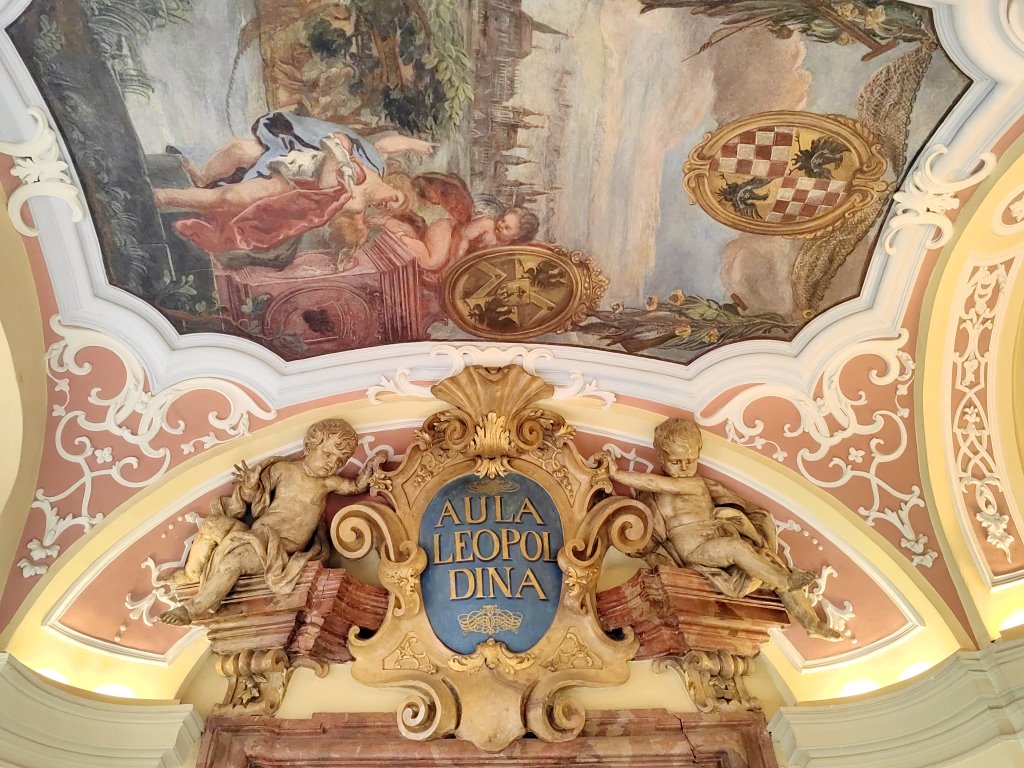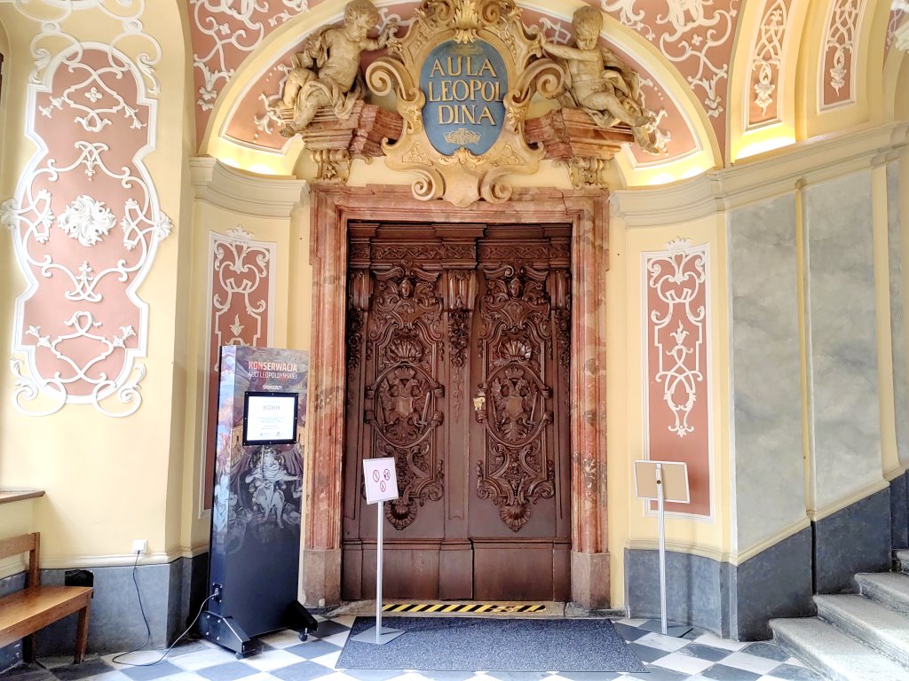 Aula Leopoldyńska, największa i najbardziej reprezentacyjna część głównego gmachu Uniwersytetu Wrocławskiego, to cenny i unikatowy zabytek świecki późnego baroku. Wzniesiona w latach 1728-1732 wraz z całym kompleksem budynków uniwersyteckich, otrzymała swoją nazwę na cześć cesarza Leopolda I, fundatora Uniwersytetu w roku 1702. Aulę projektował Christophorus Tausch, uczeń Andrei Pozza, znanego włoskiego architekta, malarza i filozofa. Pokryta została freskami przez Johanna Christopha Handkego z Ołomuńca.