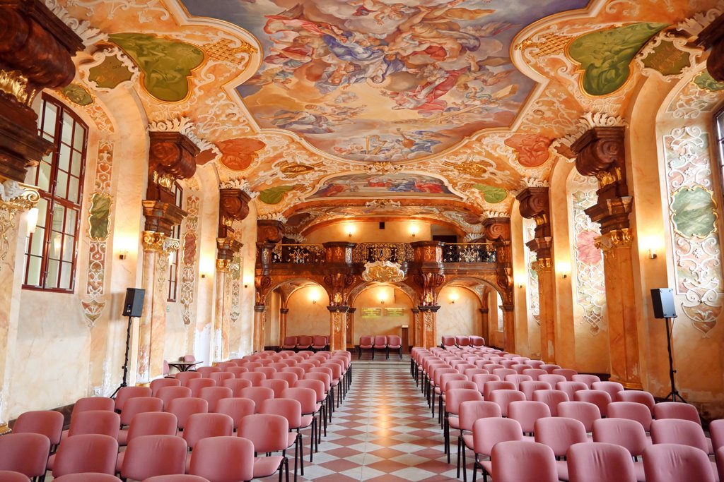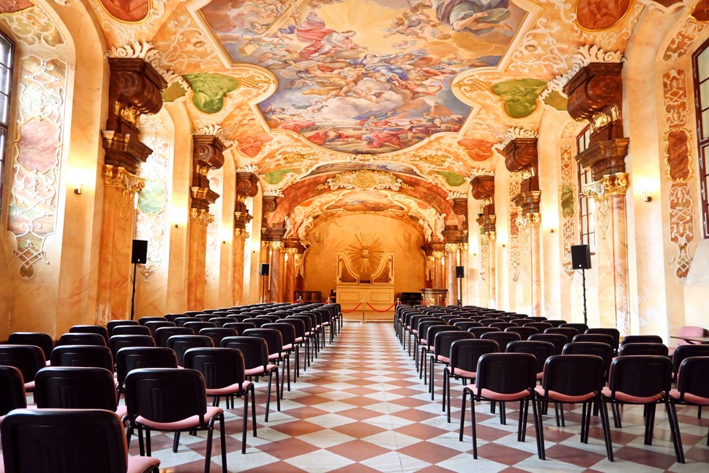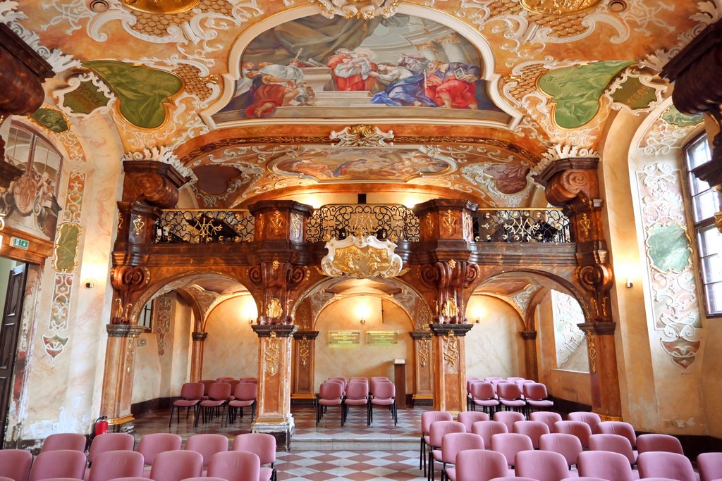 Kompozycja wnętrza – łącząca w niepodzielną całość elementy architektury i dekoracji – świadczy o związkach z twórczością Christophorusa Tauscha. Całością prac kierował Johann Blasius Peintner, a po jego śmierci – Joseph Frisch. W ramach zespołu działali artyści realizujący wcześniej Aulę Leopoldyńską i Schody Cesarskie, m. in. rzeźbiarze: Johann Albrecht Siegwitz i Franz Joseph Mangoldt, sztukatorzy i marmoryzatorzy: Johann Anton Schatzel i Ignazio Provisore oraz malarz Johann Christoph Handke z Ołomuńca.