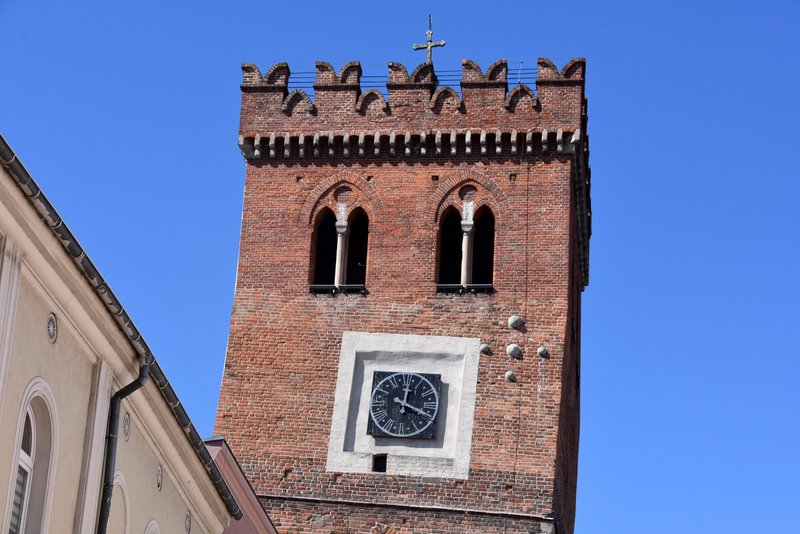 Średniowieczna wieża odchylona od pionu o 2,14 m. Na szczyt wieży mającej 34 m prowadzi 139 schodów.