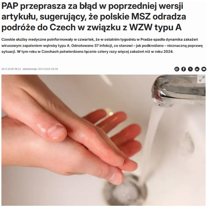 W związku z pojawieniem się informacji dotyczących wzrostu liczby zachorowań na wirusowe zapalenie wątroby typu A w Czechach, w przestrzeni medialnej pojawiły się błędne interpretacje komunikatu polskiego Ministerstwa Spraw Zagranicznych.