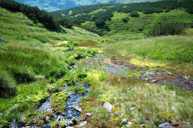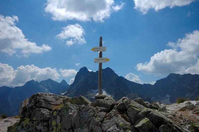 Słowacy wstali najwcześniej (znaleźli zwłoki) i to w zasadzie oni zbudzili mnie dzwonieniem „szpejów”. Czyste niebo nie zapowiadało załamania pogody więc plan był prosty: zrobić pętlę i zjeść żurek w Moku i Starej Roztoce. Powoli spakowałem sprzęt i zawiesiłem plecak na wieszaku przy ekranie pogodowym w korytarzu, a że kuchnia jeszcze była zamknięta a do łazienki długa kolejka poszedłem zmoczyć twarz do stawu. Zmoczyć, a nie kąpać się – jak to ktoś przede mną zrobił zostawiając po sobie kłęby pływającej piany z jakiegoś chemicznego badziewia. Dziewczyny otworzyły okienko i ja także, jak wiele osób na jadalni, podążyłem z kubkiem po wrzątek – no bo bez kawy się nie ruszam. Z dołu, od Roztoki zaczęli przychodzić pierwsi turyści więc stwierdziłem, że czas się ewakuować z nadciągającego mrowiska. Nie brałem ze sobą plecaka więc wziąłem tylko niezbędne rzeczy i ruszyłem w stronę Szpiglasowej Przełęczy. Po odbiciu na żółty szlak, przy pierwszym strumieniu zatrzymałem się na dłuższą chwilę bo cisza i magia tego miejsca były niesamowite. Zdjąłem buty, chodziłem po gorącym mokrym mchu i cieszyłem się jak niemowlak. Stopy zapadały się, a woda wypływała i zakrywała stopy… Cudowne uczucie. W oddali słychać było odgłosy nadchodzących ludzi od strony przełęczy więc czas był i na mnie. Chwilę jednak szedłem po gładkich kamieniach niosąc buty w rękach bo to jest zbyt przyjemne. Miałem pewien cel więc po dojściu do ścieżki z ostrym piaskiem założylem buty i ruszyłem ostro do przodu. Podejście i łańcuchy bez obciążenia plecakiem okazały się tym razem drobiazgiem i po około 95 minutach od wyjścia ze schroniska, stałem na przełęczy.