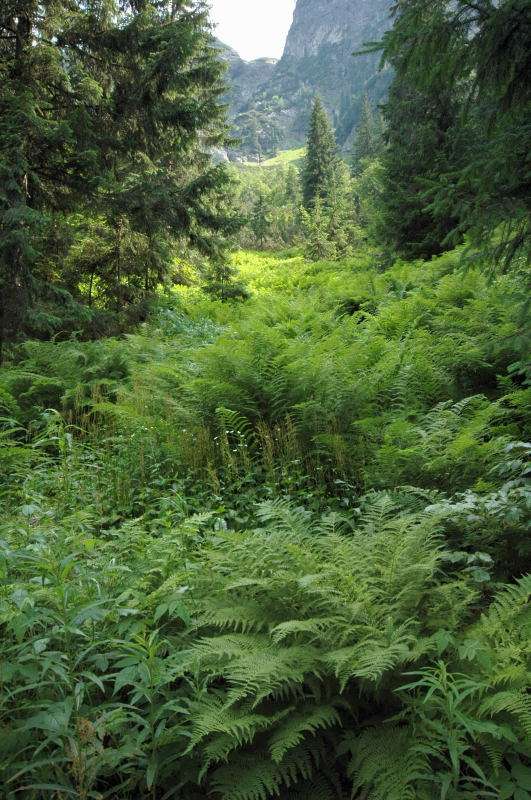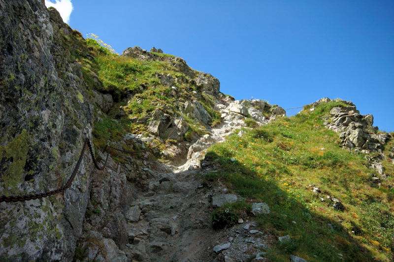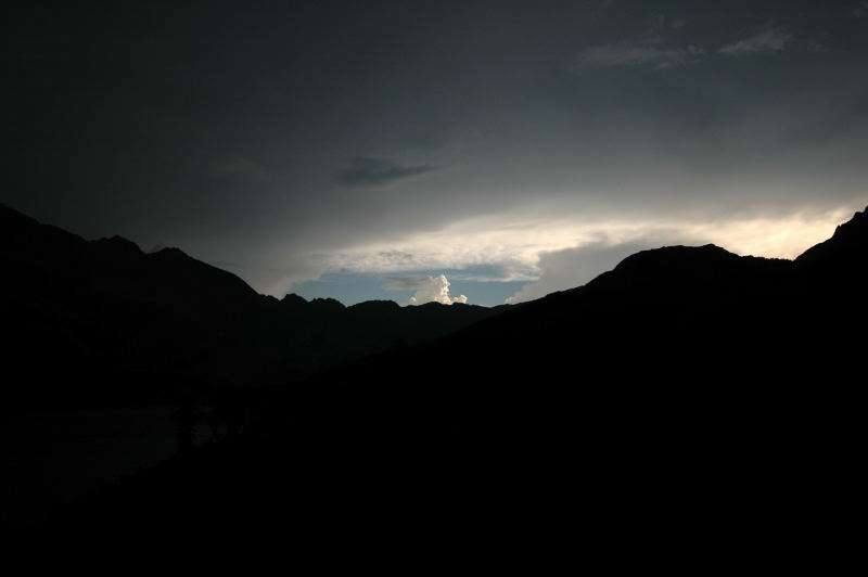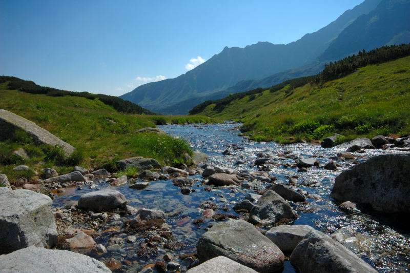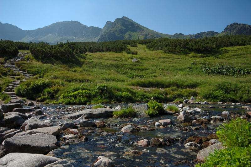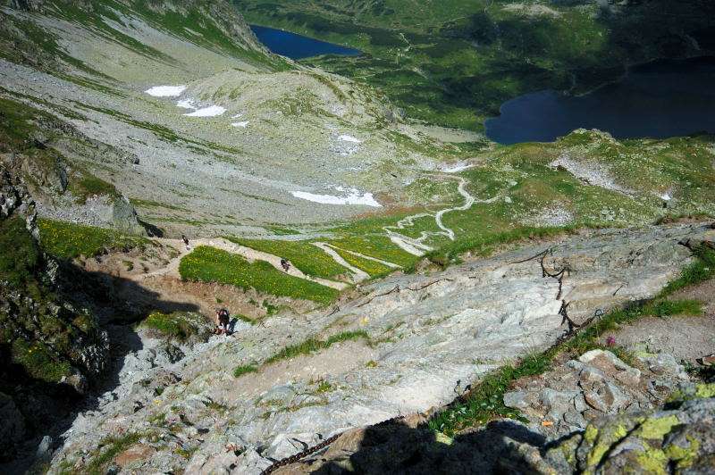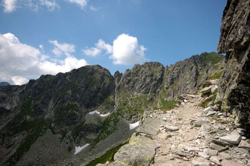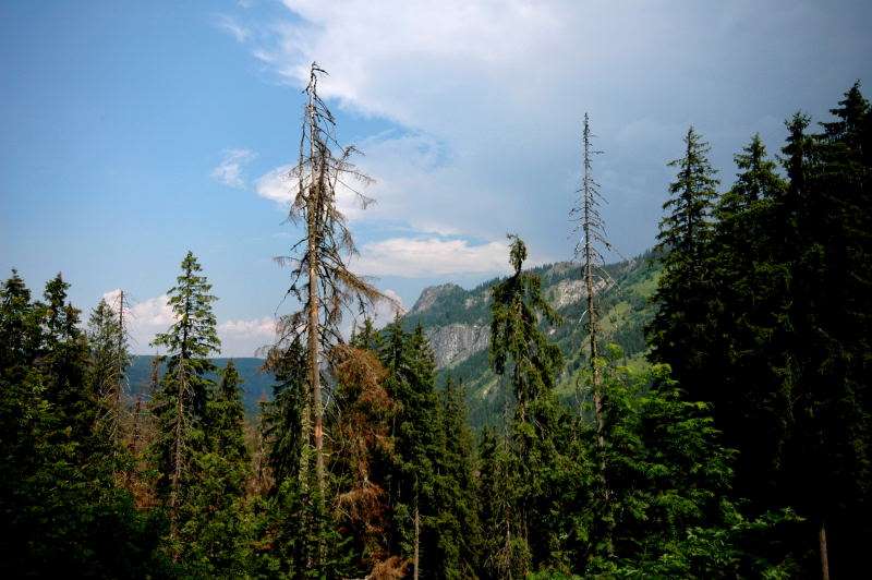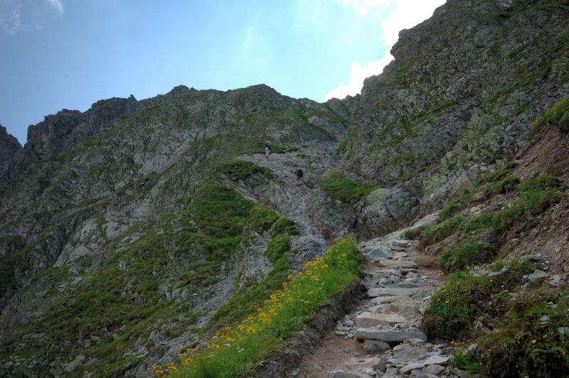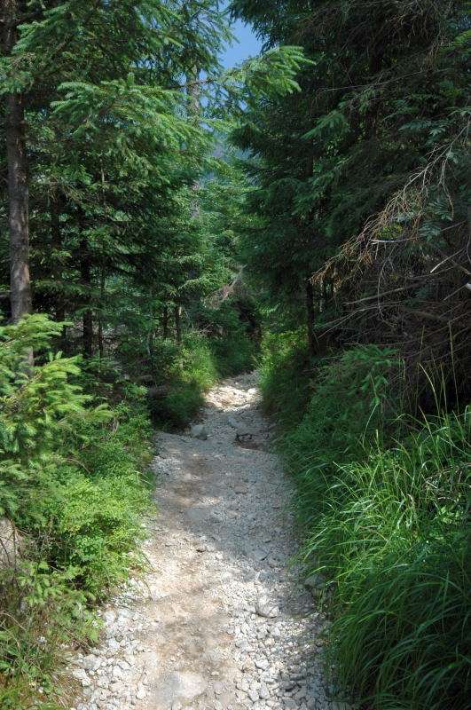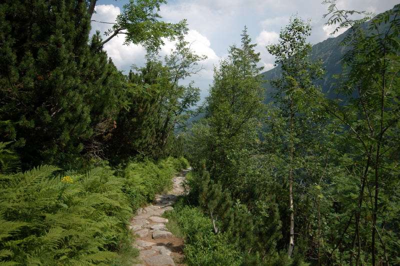 Burza kłębiła sięnad Tatrami Bielskimi i powoli przenosiła się nad rejon Rysów więc zaryzykowałem i ruszyłem Roztoką do „Piątki”. Przechodząc ponownie obok Wodogrzmotów, wpadłem we wciąż napierający do góry tłum, który jakby ślepy i głuchy nie widział co nad nimi i przed nimi się szykuje. Na trasie Roztoki było jeszcze dosyć tłumnie ale zdecydowaną większość stanowiły osoby schodzące. Dosyć szybko minęła mi trasa i dotarłem do dolnej platformy wyciągu technicznego schroniska. Tu popełniłem błąd bo ruszyłem w stronę Śiklawy zamiast szybszym szlakiem czarnym do schroniska.