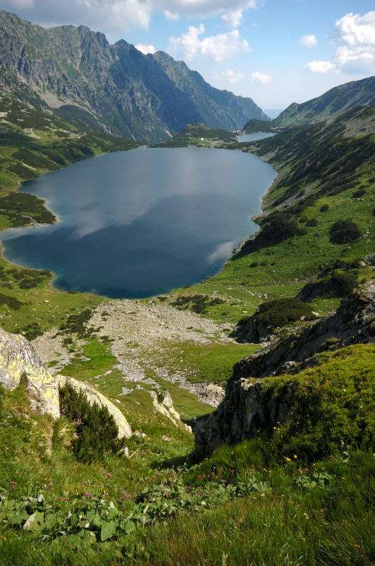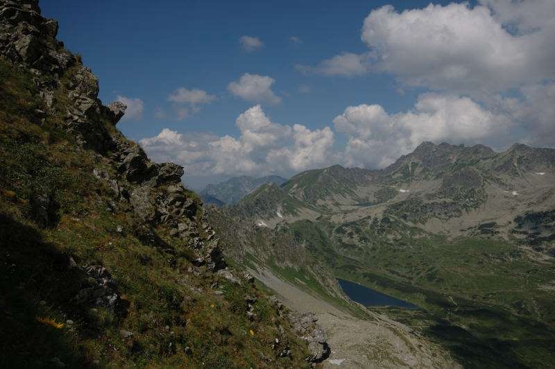 Od strony Tatr Bielskich nadciągała burza i to zdecydowało o tym, że nie wchodziłem już na szczyt Szpiglasowego Wierchu tylko szlakiem zółtym podążyłem w stronę Morskiego Oka. Oczywiście po drodze mijałem wielu „niedzielnych” klapkowiczów podążających w przeciwną stronę, wielu z nich zdziwonych że ja już schodzę. Zszedłem do Moka – a jakże – ale wybaczcie że nie opiszę Wam jak smakował żurek w najpopularniejszej knajpie w Tatrach bo Grunwald i Oblężenie Malborka przy tym to pikuś (przepraszam Pana Pikusia). Z przerażeniem w oczach i brakiem woli walki o przejście i miejsca w osobnych kolejkach, machnąłem tylko kilka fotek i pospiesznie ruszyłem ceprostradą w dół Doliny Rybiego Potoku. Idąc pospiesznie miałem wciąż przed oczami nadciągające chmury, błyski i grzmoty ale tłum napierający z dołu, roznegliżowany przynajmniej do połowy nic sobie z tego nie robił. Dotarłem do Wodogrzmotów i stwierdziłem, że bezpiecznie będzie to przeczekać w Starej Roztoce, tym bardziej że czekał tam na mnie kolejny żurek.