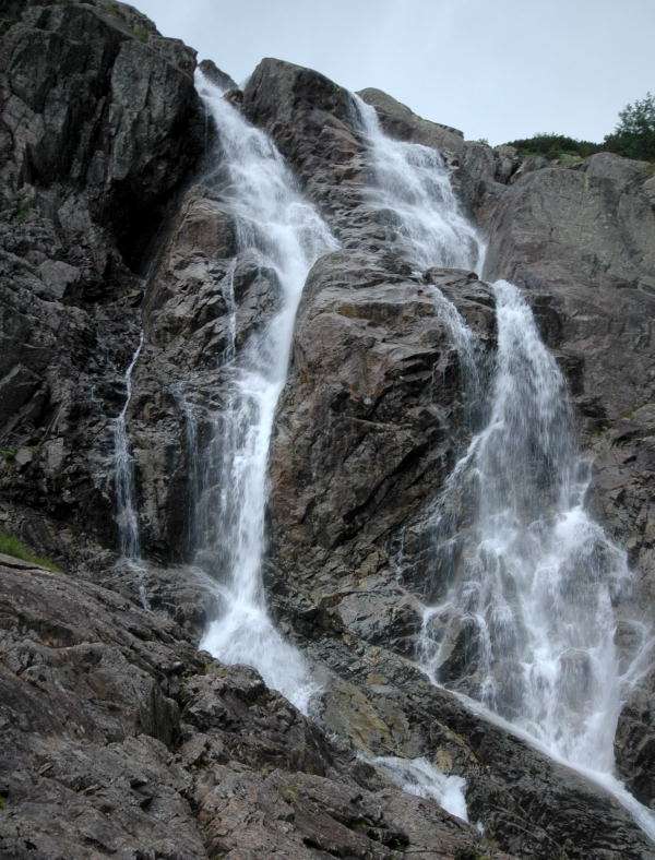 Na głazach przy wodospadzie spadły pierwsze ciężkie krople deszczu jednak nie uszedłem kilkunastu kroków kiedy rozpętała się nawałnica przechodząca w gruby grad. Rozwinąłem folię NRC ale ona chroni przed utratą ciepła, a nie przed żywiołem atakującym w każdej płaszczyźnie. Nie dowiedziałem się czy ta folia ściąga pioruny bo dobiegłem do przewieszonej skały w poszukiwaniu iluzorycznego schronienia. Iluzorycznemu – bo woda spływała ze skały strumieniem i zaatakowała mnie od tyłu wlewając się do butów od góry. W każdym razie przynajmniej nie stałem na otwartej przestrzeni. Z ciekiem wodnym w trakcie burzy może nie zachowałem ostrożności ale przynajmniej nie łapałem już piorunów 3 metrami kwadratowymi folii aluminiowej.