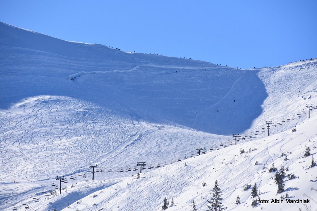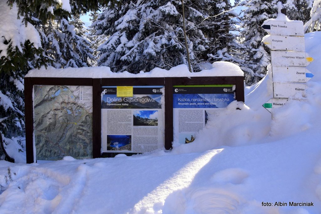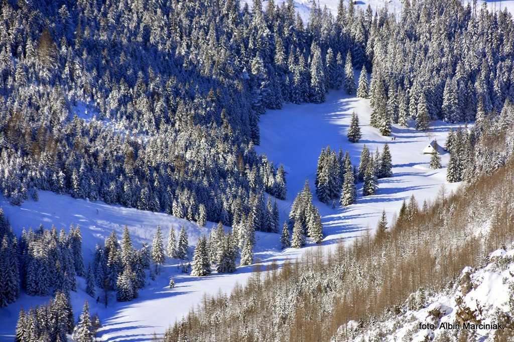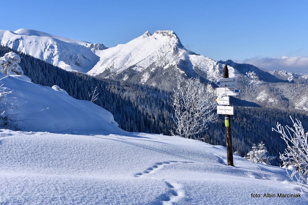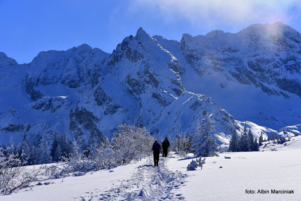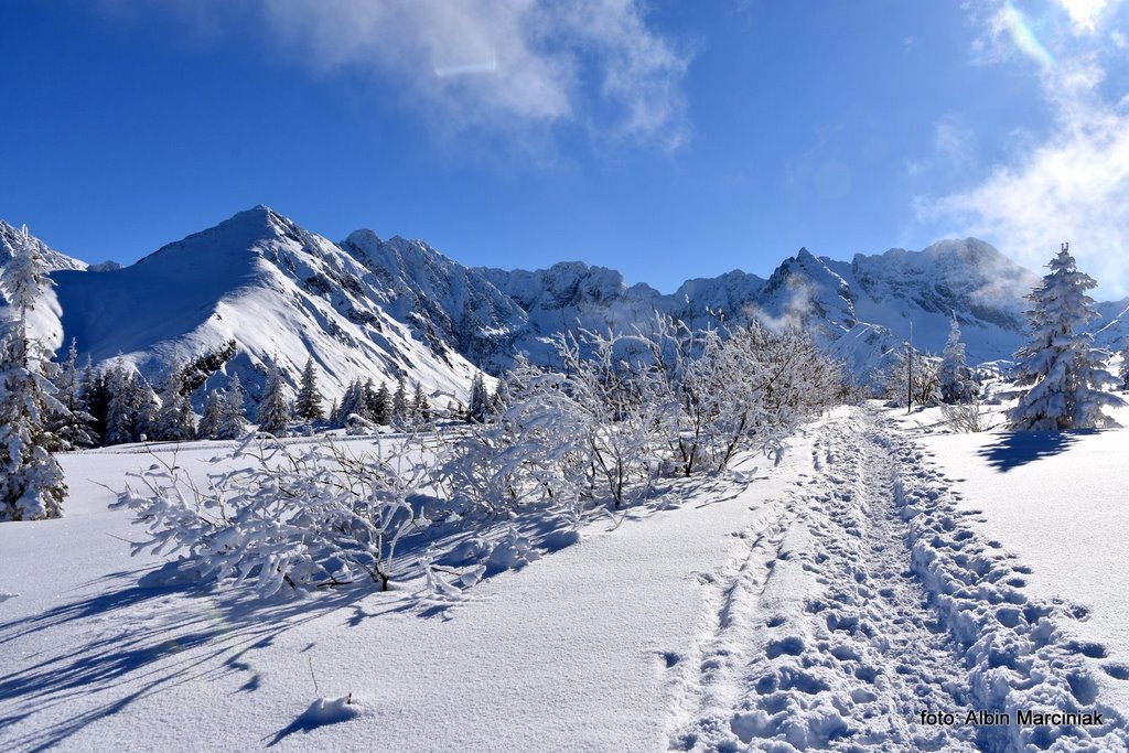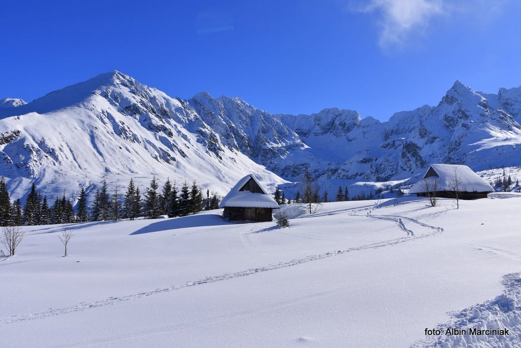 Jak dotrzeć do jednej z najpiękniejszych dolin w Tatrach, bez dużego wysiłku, bez trudności technicznych a przy dobrej pogodzie całkiem bezpiecznie? Nie jest to droga do Morskiego Oka czy droga w dolinie Kościeliskiej czy Chochołowskiej. To piękny widokowo szlak do Doliny Gąsienicowej. Szlak który pokonamy w podobnym czasie jak te wcześniej wymienione, lecz widoki są wyjątkowe. Wyruszamy z doliny po wyjściu z busa a niewiele później podziwiamy piękną panoramę na Zakopane, Nowy Targ i dużą część Małopolski. Przy sprzyjającej pogodzie możemy oglądać nie tylko Tatry ale także Babią Górę, Turbacz a nawet Trzy Korony w Pieninach. Chwilę później stajemy oko w oko z majestatyczną granią Orlej Perci. Panorama jest imponująca bo przed nami od lewej jest Wielka Koszysta, Żółta Turnia i Kościelec a za nimi grań Orlej Perci. Dalej w prawo Świnica, Liliowe i zbocza Kasprowego Wierchu. W dole natomiast krzyżuje się wiele szlaków prowadzących na te szczyty oraz do kolejnych dolin. Zachwycać się tutaj można o każdej porze roku, lecz właśnie w zimie jest tutaj wyjątkowo i nieco spokojniej niż w lecie.