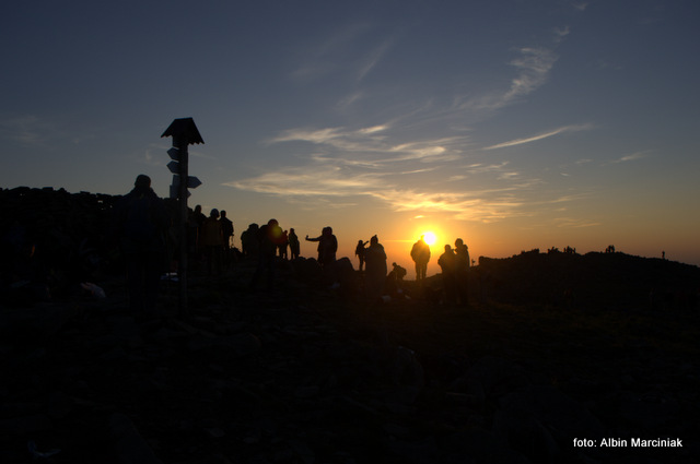 Wschód Słońca był zjawiskowy, choć liczba dobrze ponad 200 ludzi na szczycie na wschodzie Słolńca przeszła najśmielsze oczekiwania 🙂Żałuję, że nie dotarłem na szczyt rano, ale nieść nosidło Jana Niezbędnego, własny plecak i Bartka, któremu rozwaliły się buty – to już dla mnie zbyt wiele.