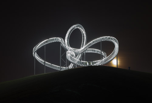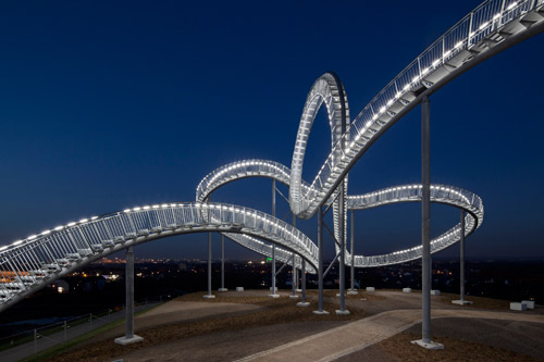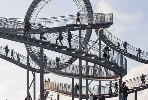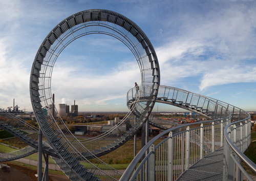 Od połowy listopada 2011 roku na wzgórzu Heinrich Hildebrand Höhe w południowym Duisburgu w Niemczech otwarto dla zwiedzających pierwszą kolejkę górską dla pieszych. Kolejka „Tiger and Turtle – Magic Mountain” (z ang. tygrys i żółw – magiczne wzgórze) w najwyższym punkcie dochodzi do 45 metrów wysokości. Każdy odwiedzający może wspinać się po „torach” kolejki, które w rzeczywistości są niekończącą się klatką schodową – nawet w miejscu pętli, gdzie schody są umieszczone do góry nogami. „Tiger and Turtle” autorstwa Heike Mutter i Ulrich Genth to rzeźba, dzieło sztuki w dużej skali. Biorąc też pod uwagę konstrukcję schodów, których układ uwzględnia całość trójwymiarowej formy „Tiger and Turtle” i każdy z nich zbudowany po innym kątem jest to majstersztyk inżynierii.