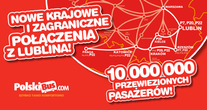 PolskiBus.com ma przyjemność poinformować, iż od momentu rozpoczęcia działalności zostało sprzedanych już ponad 10 000 000 biletów! Ogromną popularnością cieszy się nowa linia P7 Warszawa – Lublin – Rzeszów na którą sprzedaliśmy ponad 16 000 biletów,