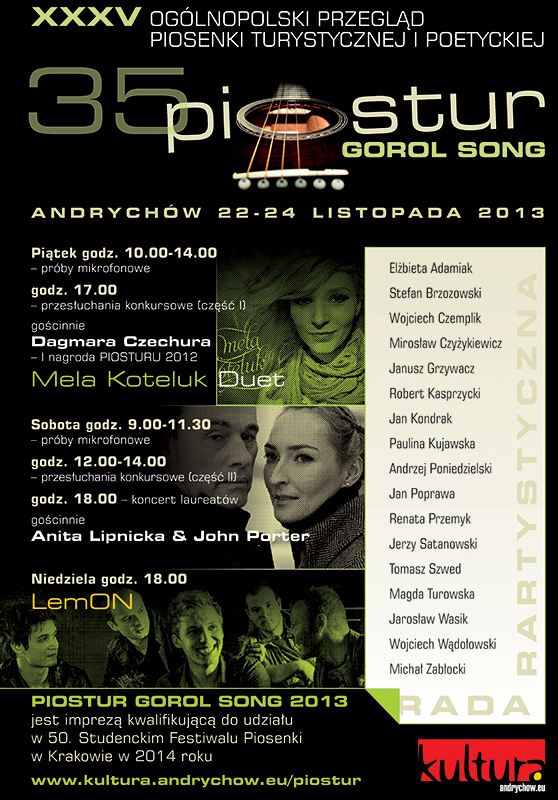 Warto być w dniach 22/24.11.2013 w Andrychowie, u stop Beskidu Małego. W czasie koncertów poznamy laureatów Przeglądu. Będzie można także posłuchać tak znakomitych gości, jak: Anita Lipnicka i John Porter, Mela Koteluk – laureatka tegorocznej edycji Fryderyków, a na zakończenie imprezy wystąpi LemOn, zwycięzca trzeciej edycji Must Be The Music. Warto także pamiętać, ze PIOSTUR jest impreza kwalifikująca do 50. Studenckiego Festiwalu Piosenki w Krakowie oraz do Ogólnopolskiego Festiwalu Piosenki Artystycznej w Rybniku, dla kandydatów jest to wiec ostatnia chwila na zgłoszenie swojego udziału w Przeglądzie. Szczegółowe informacje znajdują się na stronie : http://www.kultura.andrychow.eu/piostur/2013/index.htm