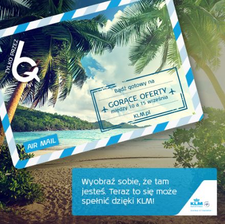 Warszawa, 1 września 2014 r. – Tym razem KLM zaprasza do rywalizacji, w której stawką są dwa bilety lotnicze na bajeczne Wyspy Karaibskie. Niecodzienny konkurs jest zapowiedzią nadchodzącej, sześciodniowej promocji cenowej KLM, która ruszy już 10 września br. i obejmie 25 egotycznych kierunków! Udział w nim może wziąć każdy. By wygrać, wystarczy zarejestrować się na stronie konkursowej http://www.wyobrazsiebietutaj.pl, i stworzyć nietuzinkową treść e-kartki z wyimaginowanej podróży w daleki świat. Autor najbardziej kreatywnego wpisu poleci wraz z osobą towarzyszącą na bajeczną wyspę Curacao! Natomiast uczestnicy głosowania na najlepszą e-kartkę mogą wygrać weekend w Amsterdamie! Zapraszamy do zabawy!