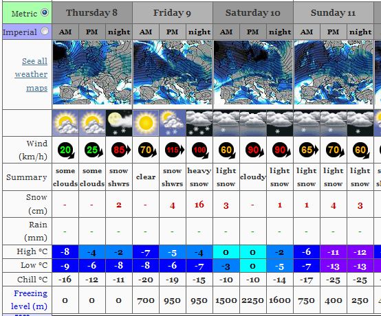 Nie będzie łatwo bo pogoda nie rozpieści w ten weekend. Po zachodzie słońca ma ostro popadać i nieźle powiać. Zapowiadają do 115 /h i kilkanaście cm świeżego śniegu.