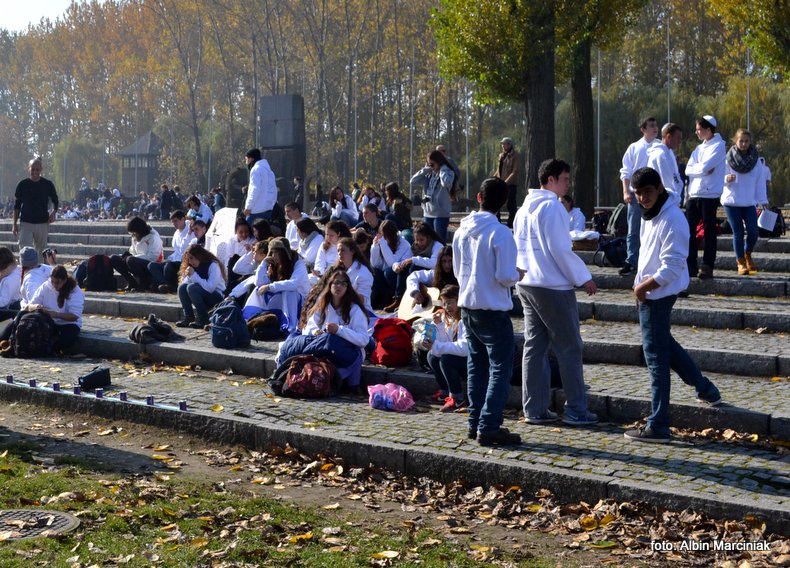 Nieco inaczej jest w Brzezince na terenie obozu Auschwitz II – Birkenau. Tu nie ma limitu wejść ale ilość ludzi byłą ogromna. To chyba okres wycieczek szkolnych z Izraela bo połowa zwiedzających to młodzież w białych polarach z gwiazdą na plecach i z flagami niczym na pikniku. Atmosferę tegoż pikniku dodawała muzyka, śmiechy i żarcie …