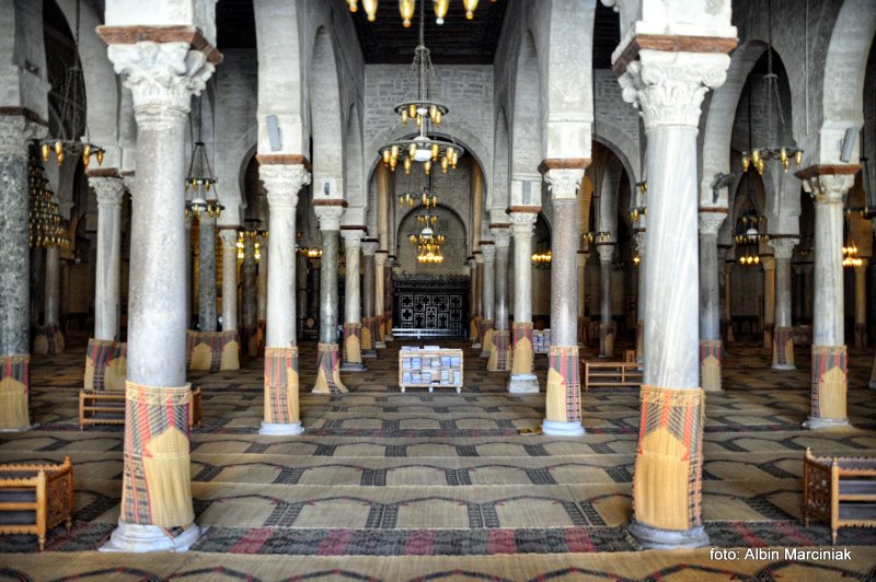 Do sali modlitewnej, zwieńczonej wielką kopułą wchodzi się przez rzeźbione drewniane drzwi z 1829 roku. Sala modlitewna złożona jest z siedemnastu naw podtrzymywanych przez 414 starożytnych kolumn marmurowych i porfirowych sprowadzonych z Kartaginy i Susy. Sala jest oświetlona żyrandolami, a na posadzce rozścielone są dywany. Główny korytarz prowadzi do kaflowej niszy modlitewnej z IX wieku. Płytki z niszy, jak i drzewo, z którego zbudowany został minbar, pochodzą z Bagdadu. Wewnątrz świątyni znajdują się również groby lokalnych świętych.
