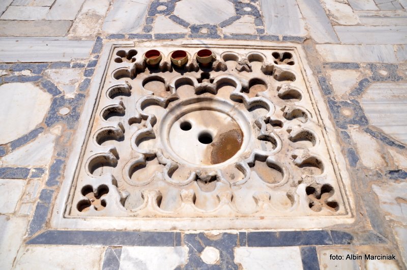 Dziedziniec otacza ok. 400 kolumn zwieńczonych łukowymi portykami. Kolumny zostały sprowadzone z różnych budowli rzymskich, bizantyjskich i chrześcijańskich. Na kolumnach nadal widoczne są religijne symbole.