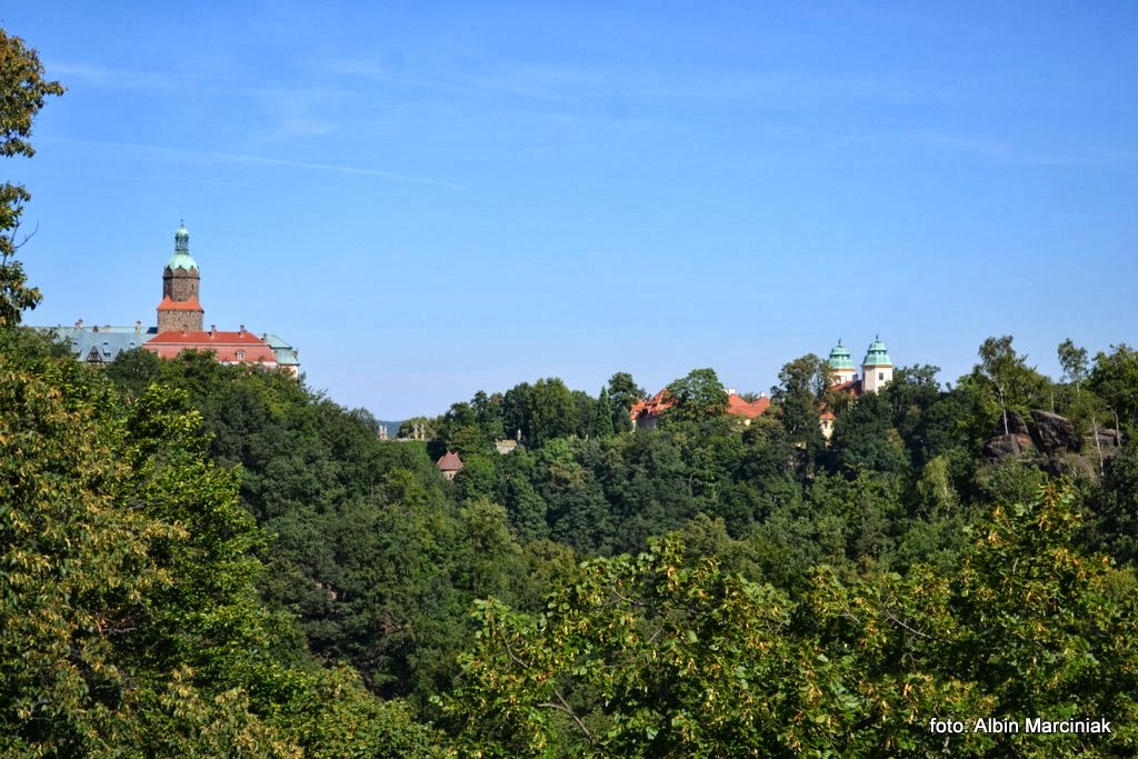 Na prawo skała znajdująca się poniżej popularnego punktu obserwacyjnego, skąd turyści podziwiają Zamek Książ