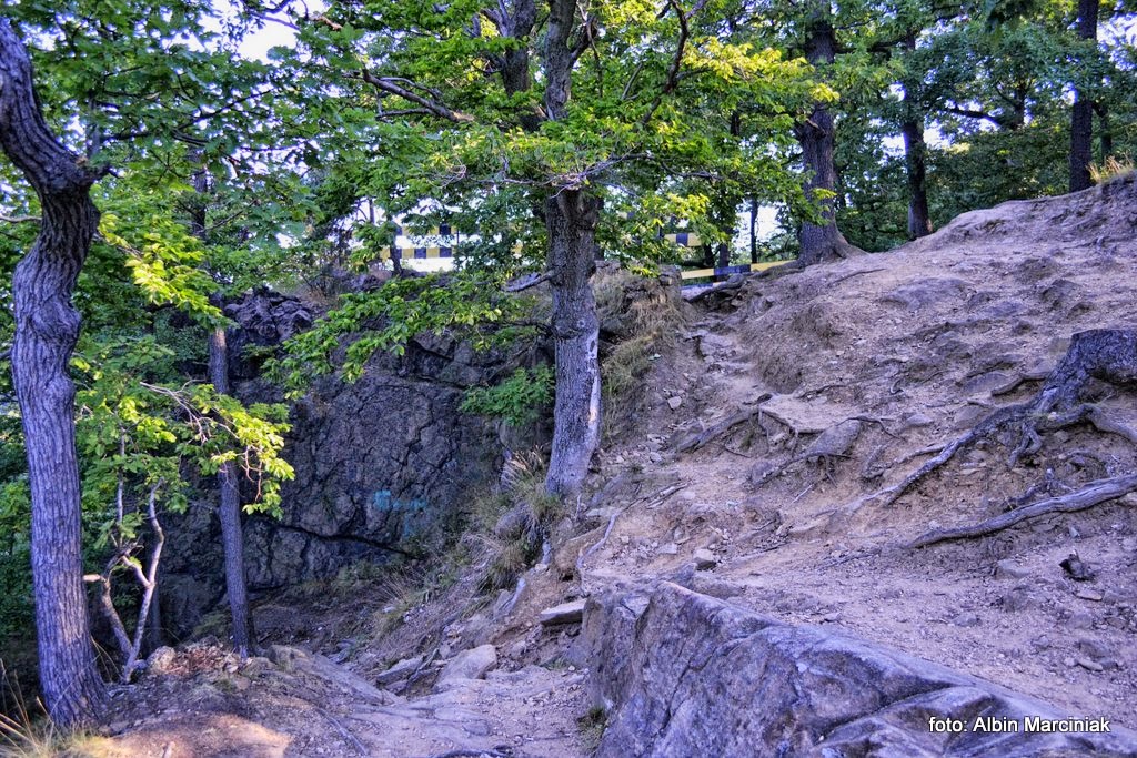 Na prawo skała znajdująca się poniżej popularnego punktu obserwacyjnego, skąd turyści podziwiają Zamek Książ