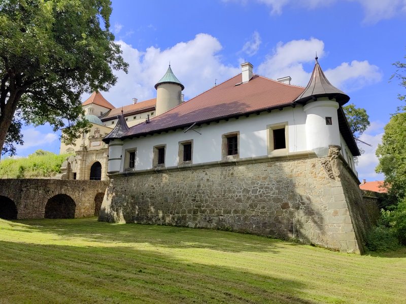 Pałac otoczony jest fortyfikacjami bastionowymi o 5-bocznym narysie, z początków XVII w., mieszczącymi w kurtynie wschodniej wczesnobarokową bramę wjazdową.