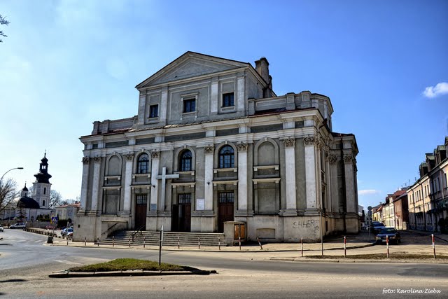 Wzniesiona w stylu późnobarokowym w II połowie w XVIII wg projektu Jerzego de Kawe. W przejściu umieszczone są płyty upamiętniające martyrologię Zamojszczyzny w czasie II wojny światowej. Na dzwonnicy umieszczono 3 zabytkowe dzwony : „Jan” ufundowany przez Jana Zamoyskiego Sobiepana w 1662 r , „ Tomasz” fundacji Tomasza Józefa Zamoyskiego z 1721 r i „Wawrzyniec „ ufundowany w 1715 r przez dziekana zamojskiego Ks. Wawrzyńca Sikorskiego.